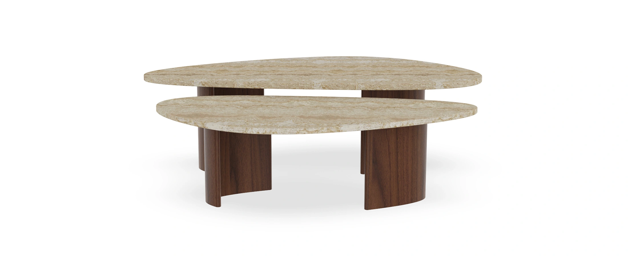 The smooth travertine tops rest gracefully on sturdy walnut bases, showcasing the harmonious blend of materials.