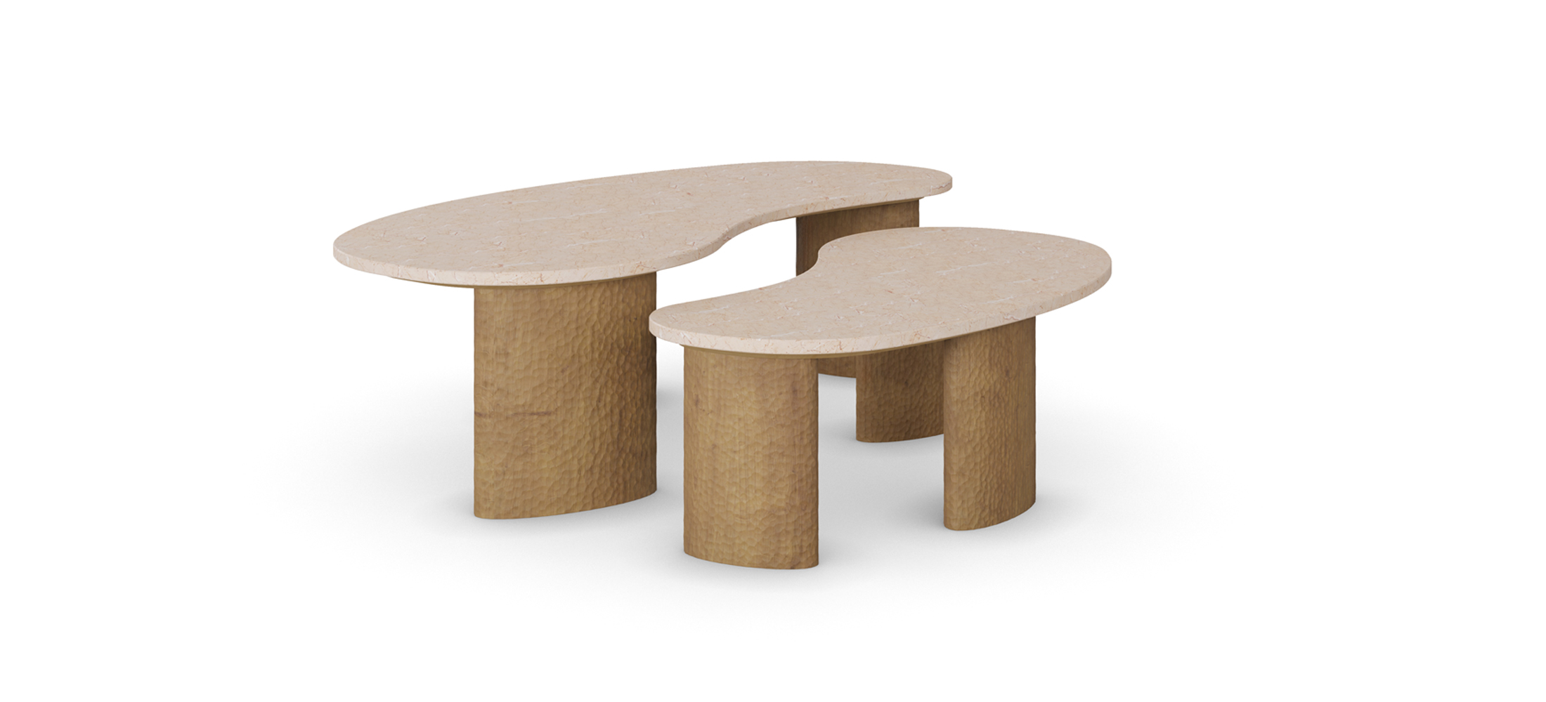 Pair with Nathalie II Sectional Sofa so the table’s curve and materiality converse with the sofa’s generous silhouette.