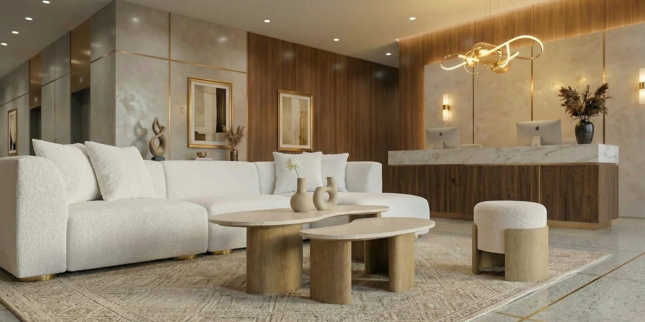 The low plan sits steady beside seating; the marble reads cool to the touch while the base introduces a warm, grounding counterpoint. The surface offers measured texture and a composed presence that complements upholstered forms.