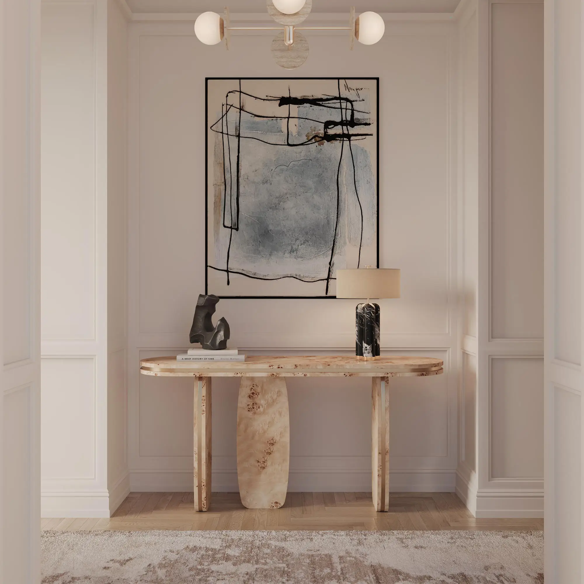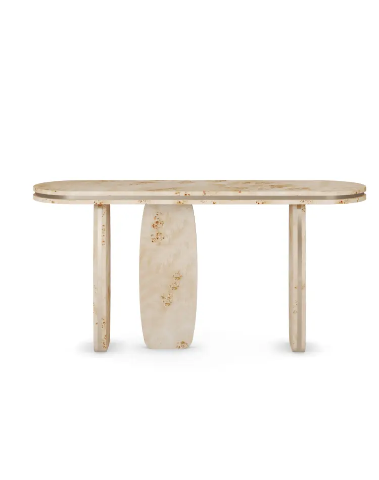 Assia Console is a poplar root console table that reads light and precise, conceived for entryways and narrow zones. The slim top and economy of depth keep circulation uncluttered while holding a clear line.
