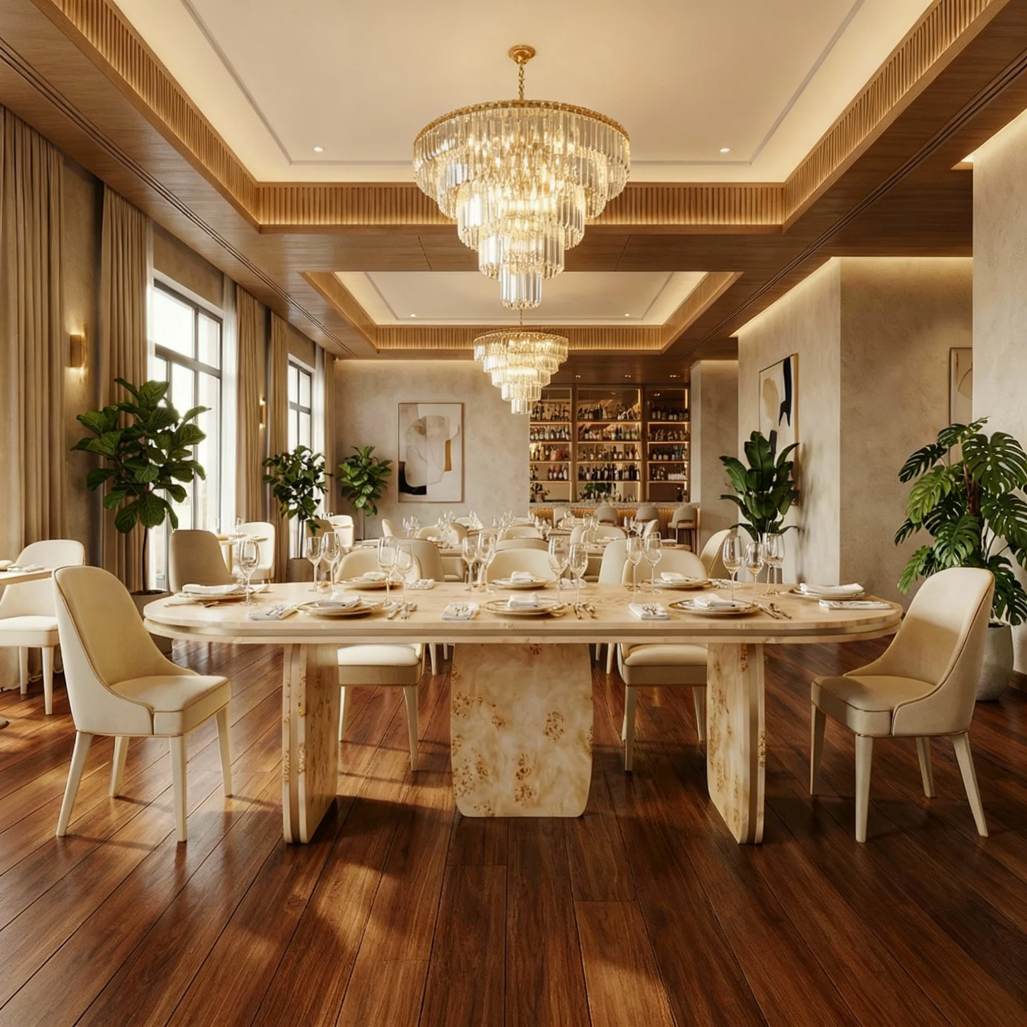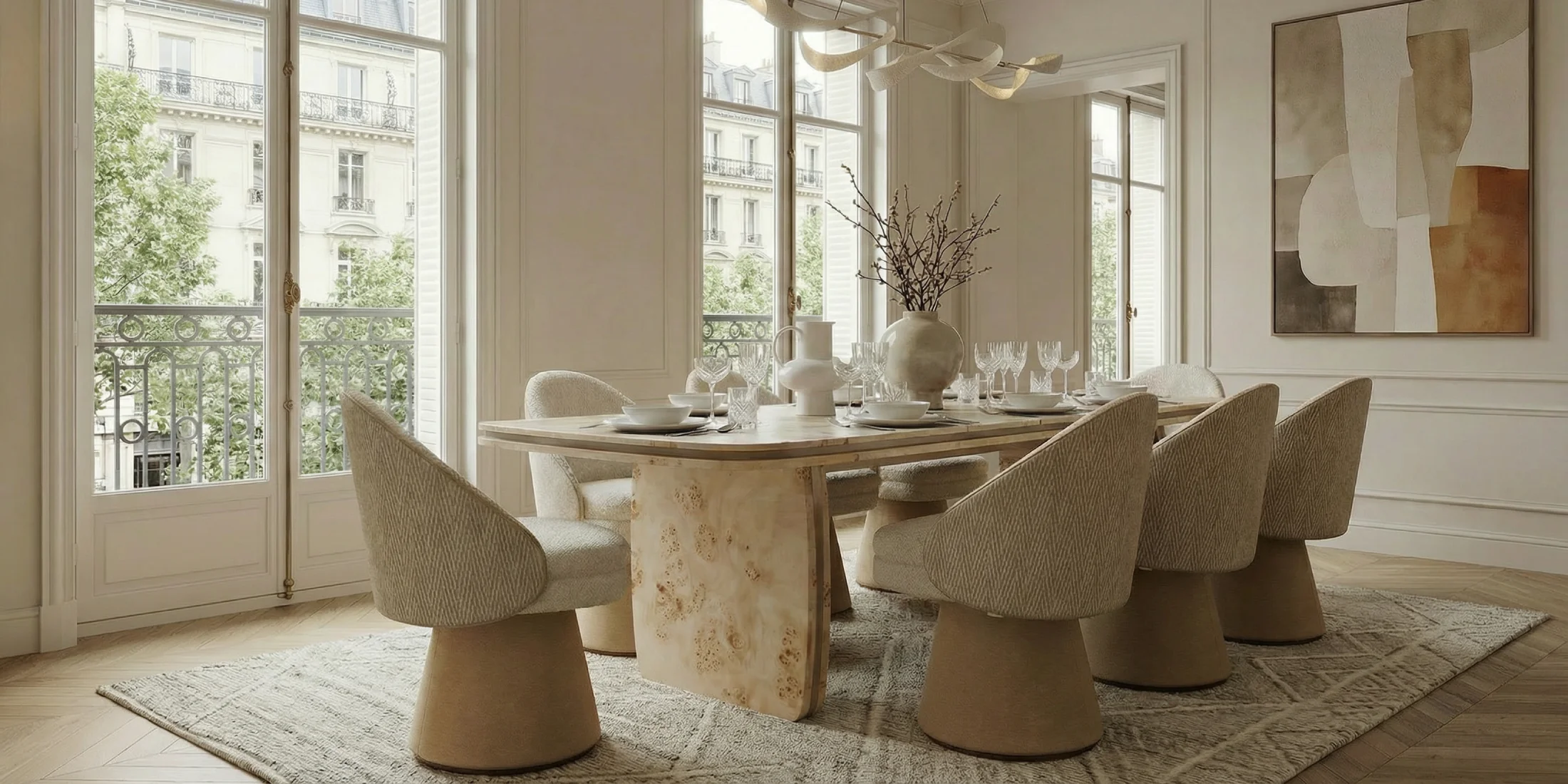 Assia is a poplar root dining table with a calm, architectural sweep that suits considered dining. The tabletop reads as a single, composed plane while the supporting geometry remains sculptural and precise.