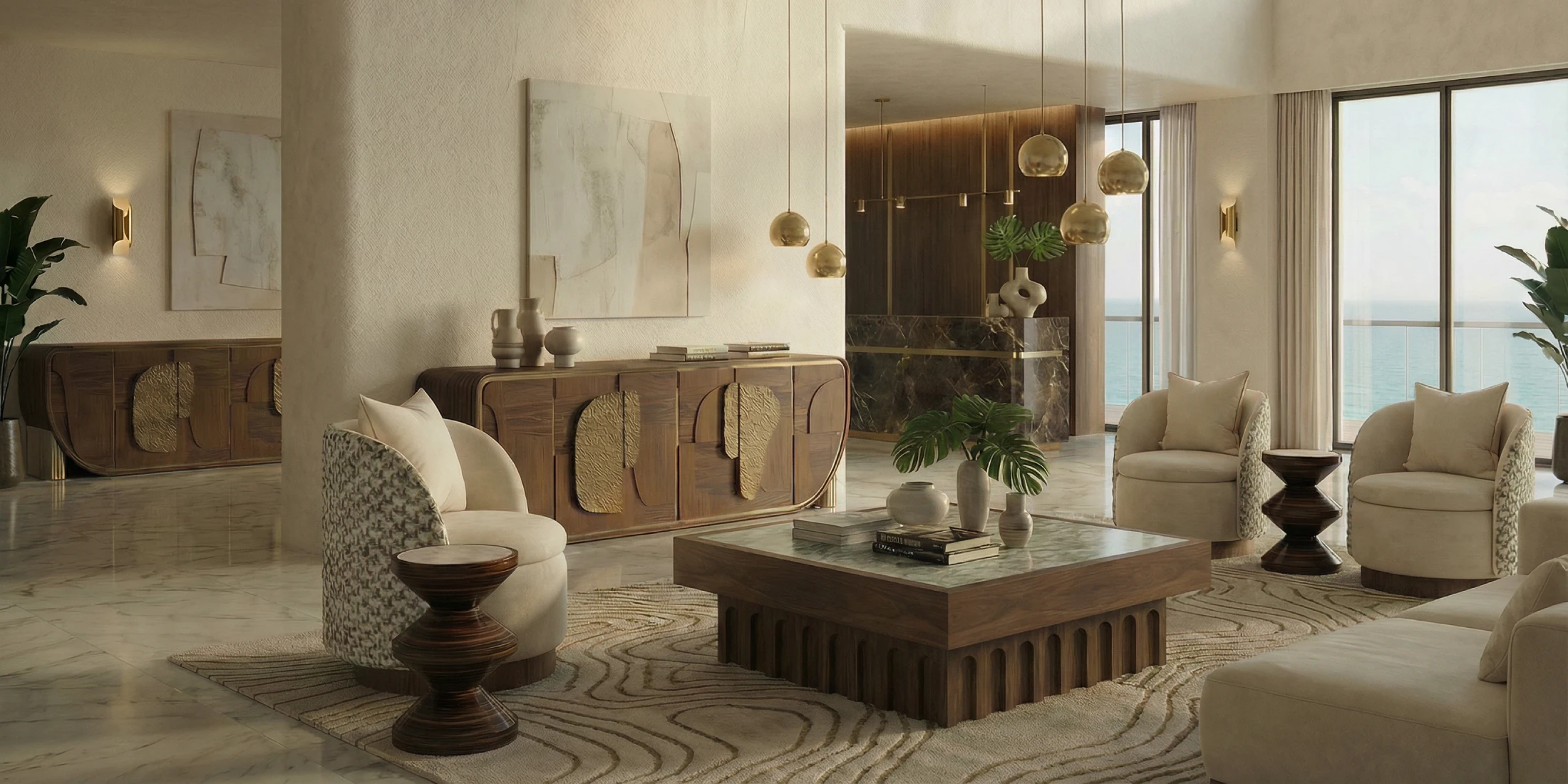 The Aurore sideboard blends bold design with organic luxury, featuring walnut and cherry wood, intricate paneling, hammered brass handles, and ribbed travertine legs – a true statement piece for any refined space.