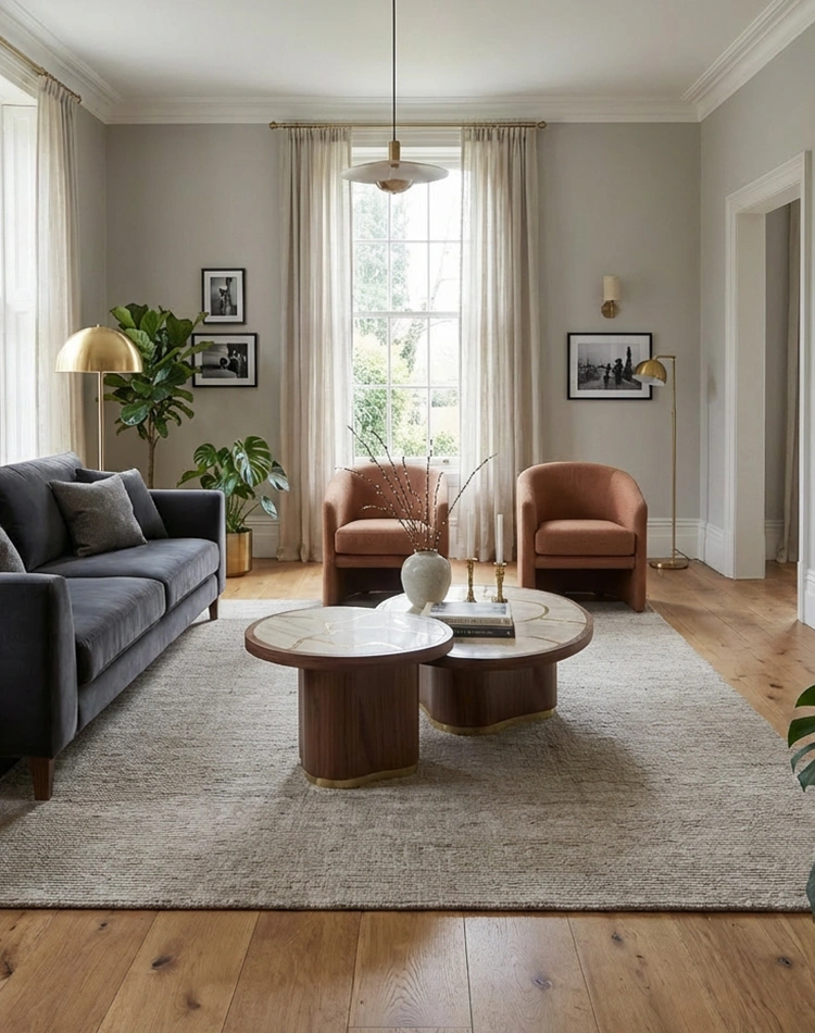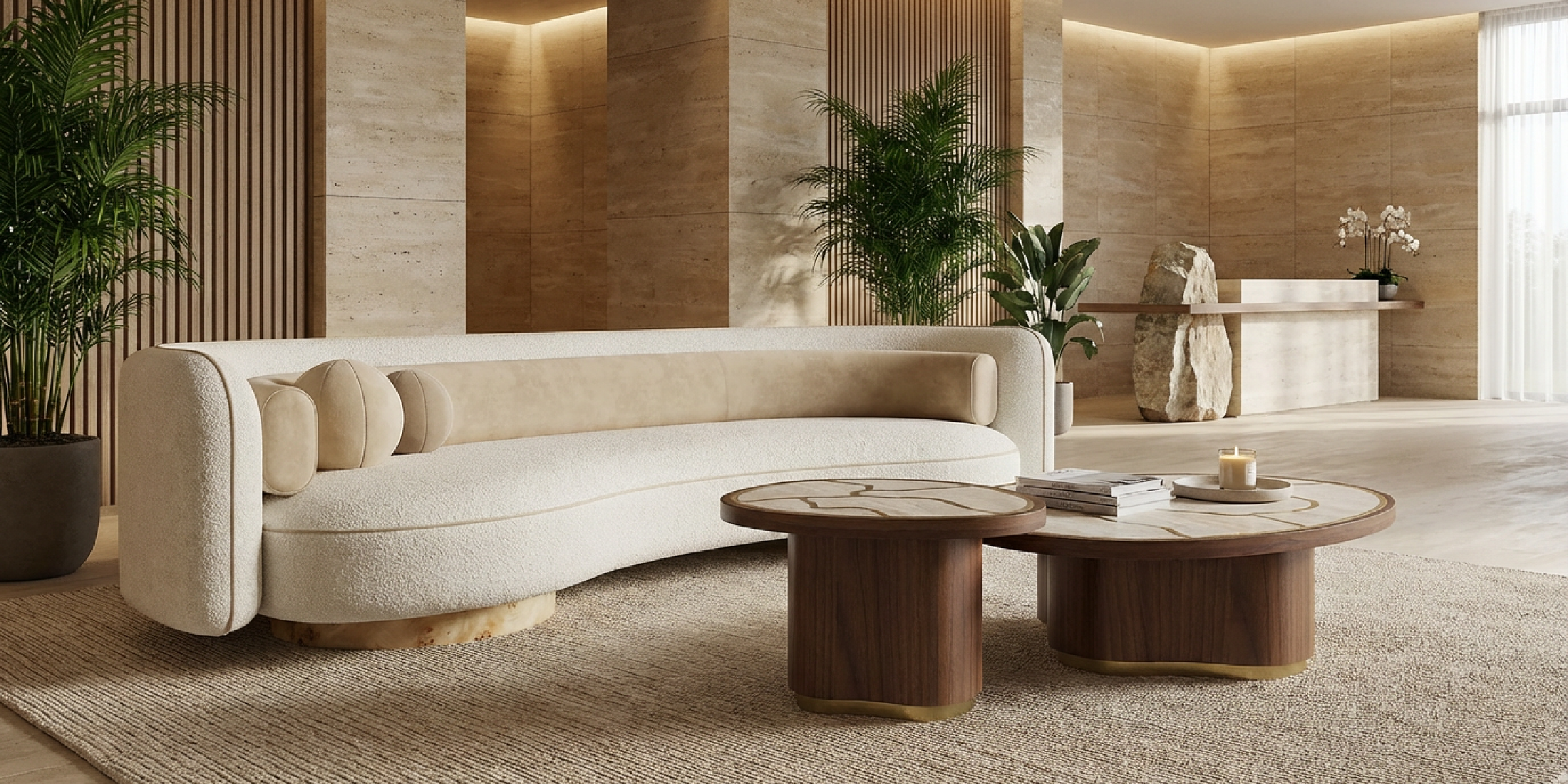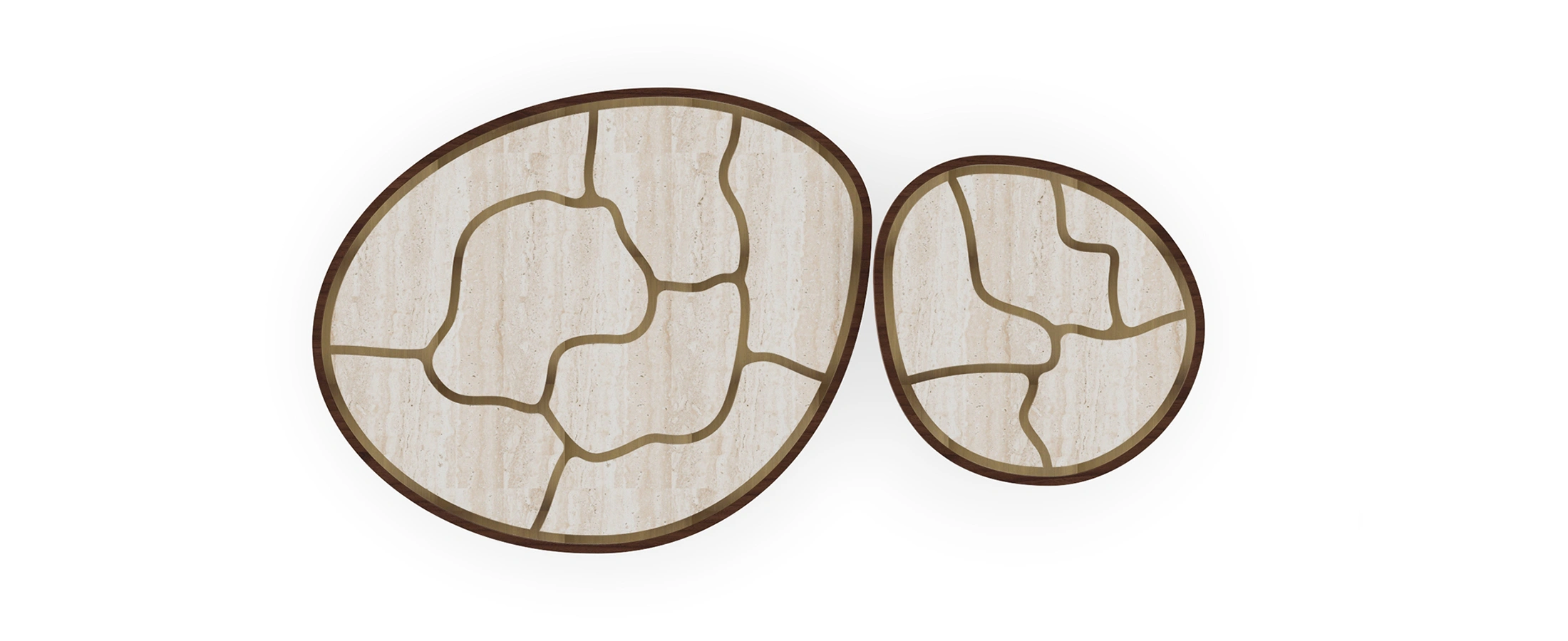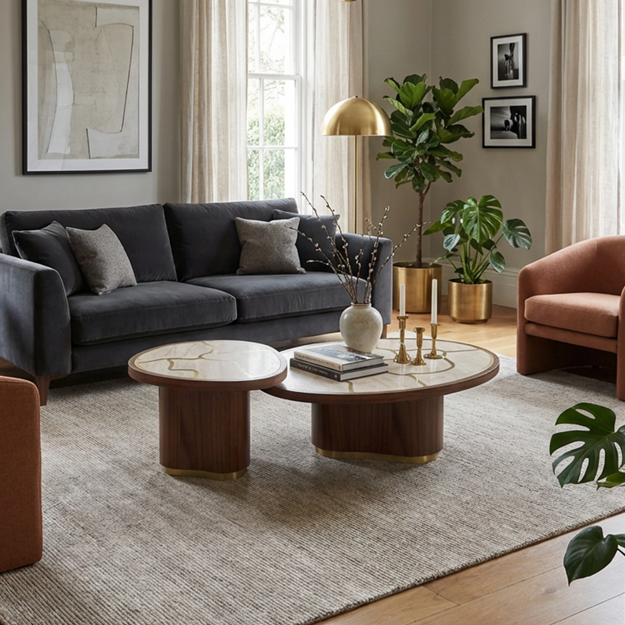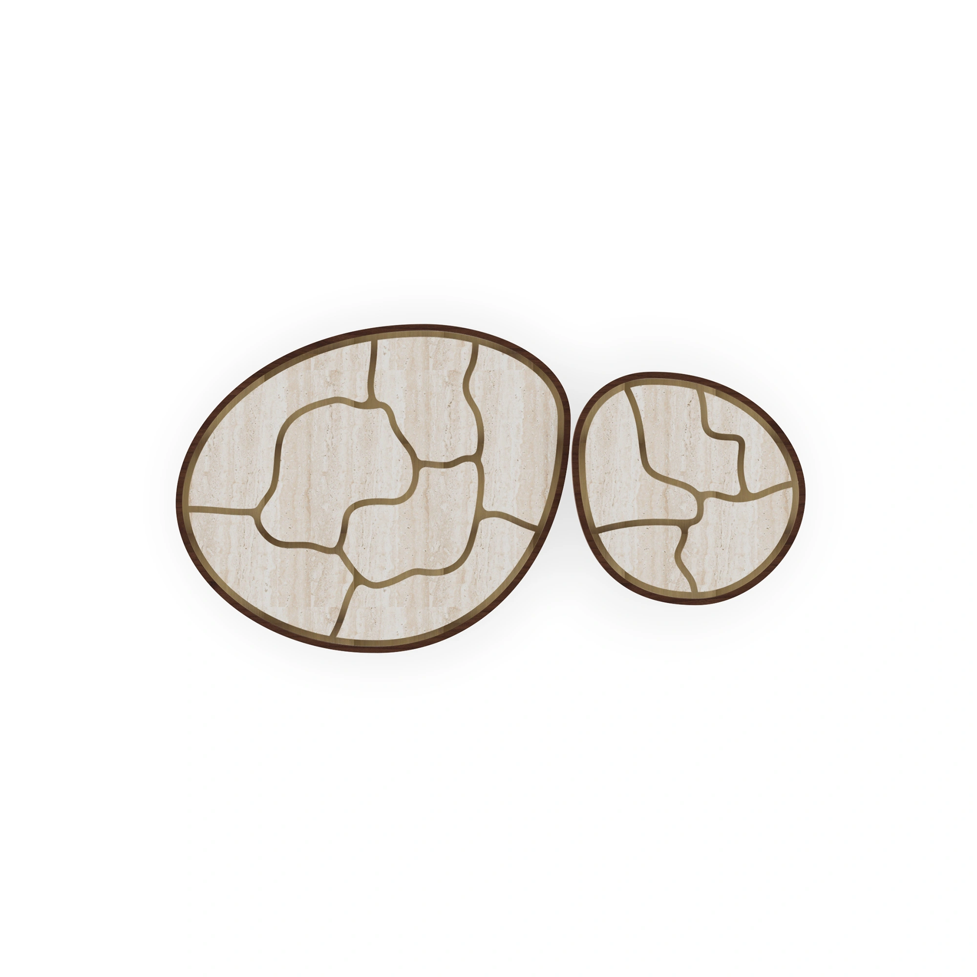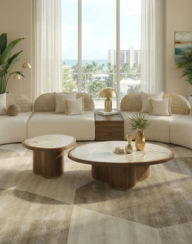Organic brass inlay meets sculptural walnut — the Calienne Coffee Table.The Calienne Coffee Table blends organic artistry with refined craftsmanship. Its stone top is framed by a walnut border and detailed with a flowing brass inlay motif that recalls natural pathways and soft geometric forms. Resting on a sculpted walnut base with a brushed brass plinth, Calienne balances visual warmth with architectural poise.