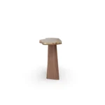 The Noria Console pairs an organically contoured stone top with sculptural, tapered walnut legs, creating a balanced dialogue between fluid form and architectural structure. A subtle brass inlay highlights the edge of the top, adding a gentle note of refinement to its quiet, understated elegance.