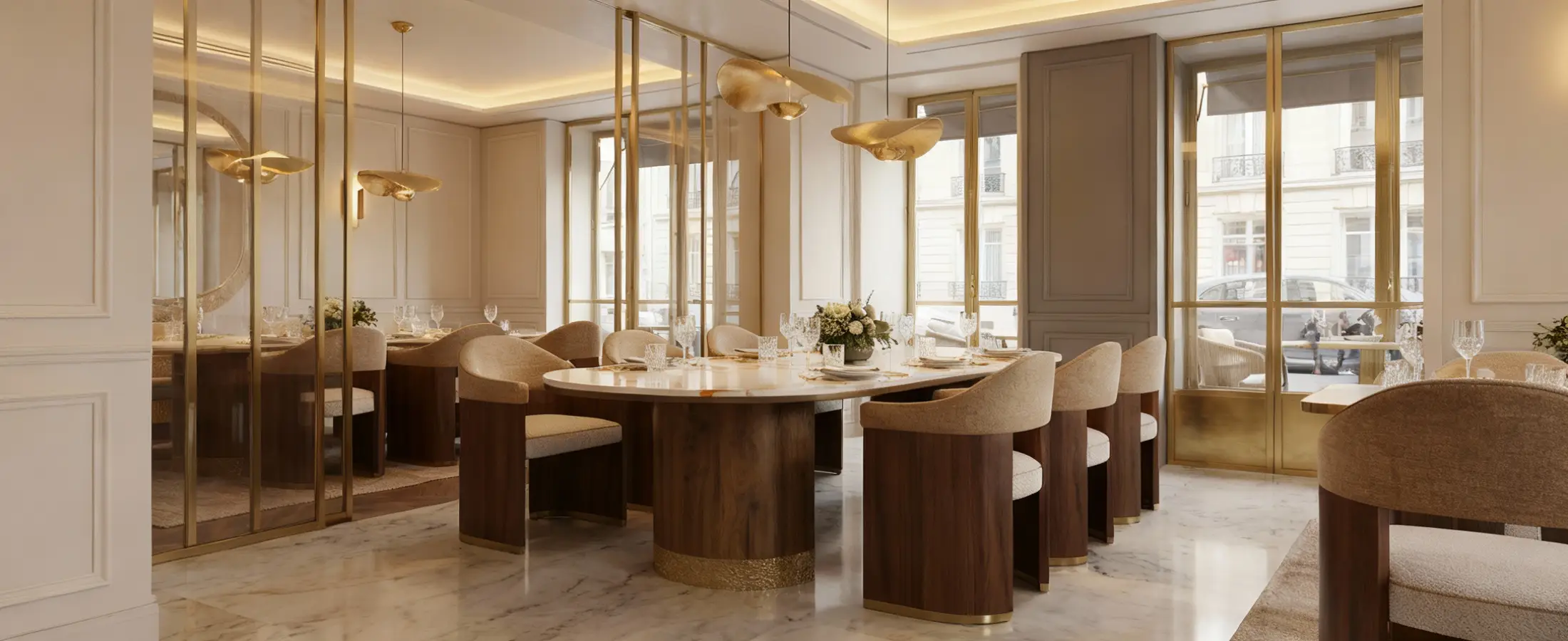 Coralie Dining Table is an Aegean Rose marble dining table, composed as a refined architectural volume that anchors dining spaces with quiet authority. Its oval geometry balances presence and circulation, allowing the room to breathe around it.