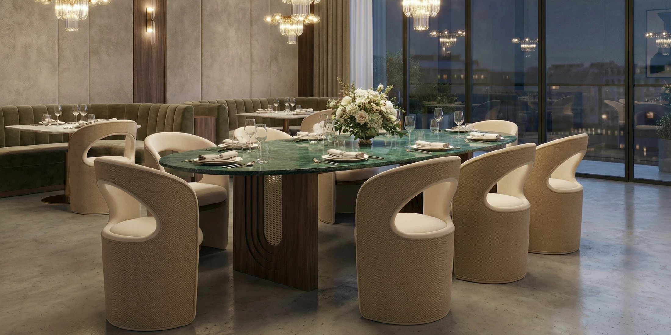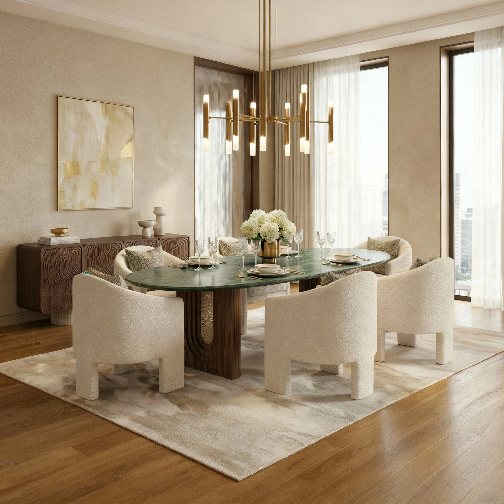 Emerald Dining Table is an emerald green marble dining table, conceived as a sculptural volume that anchors dining spaces with quiet authority. Its oval form balances presence and circulation, creating a composed focal point.