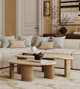 Its profile suits a handcrafted statement dining table in green stone, offering a grounded surface that reads elegant and restrained. The interplay of stone, timber, and woven detail ensures the table remains visually expressive while spatially calm.