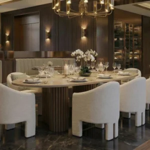 Its sleek travertine top is complemented by robust legs, featuring a mix of travertine and walnut for a striking contrast.