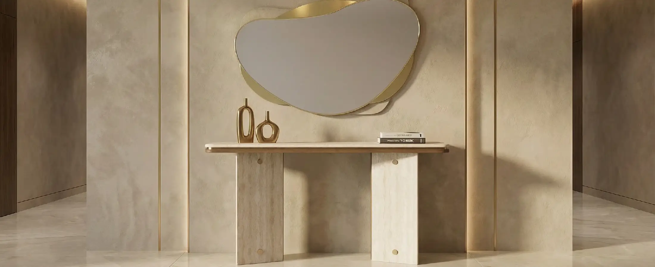 The piece is realised as a sculptural console with brass inlays and natural stone top, where warm walnut meets a subtle stone surface and precise brass inlays. Each junction is considered, allowing materials to define rhythm and texture without ornament.
