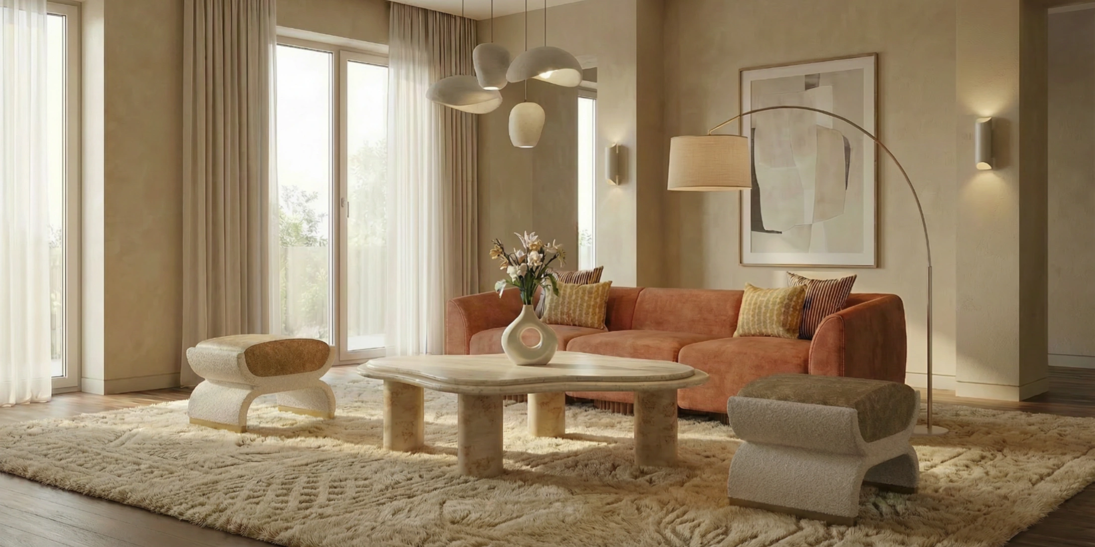 Its profile suits a handcrafted centerpiece in wood and natural stone, offering tactile depth and visual restraint. The composition reads as a contemporary designer coffee table.