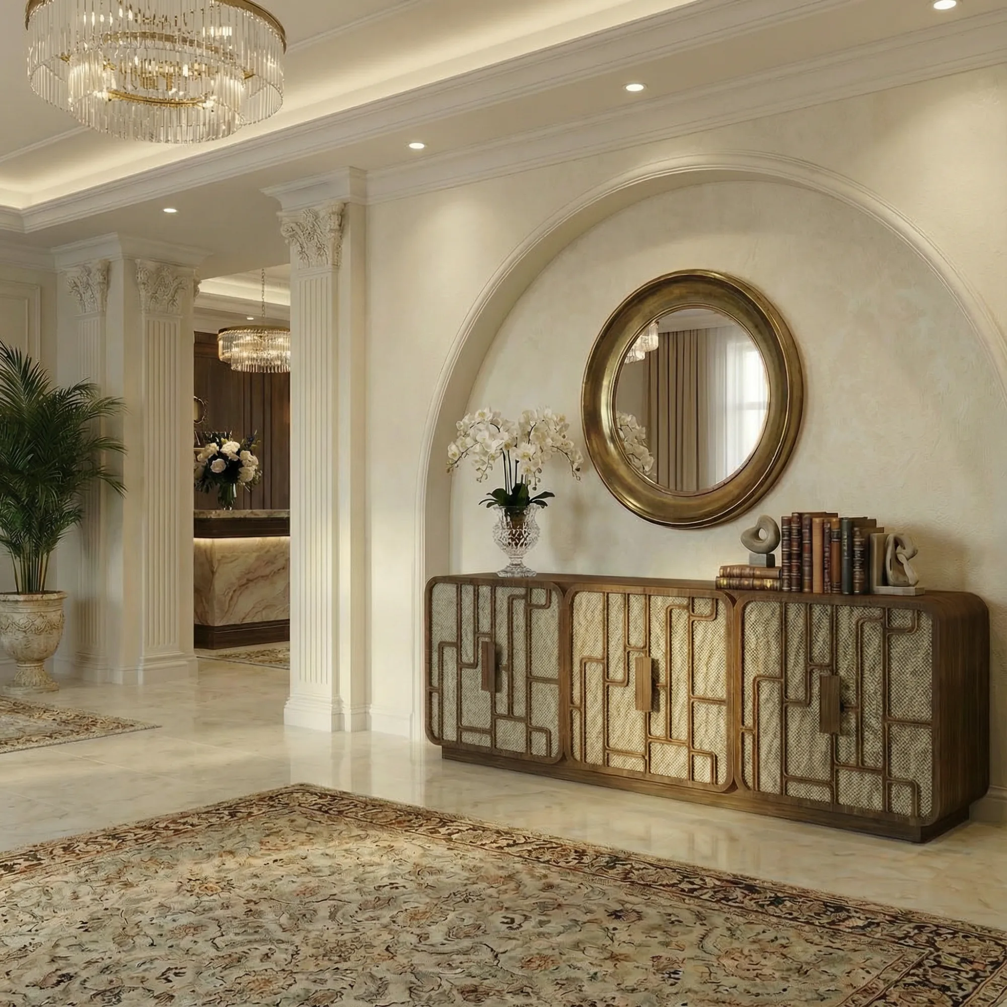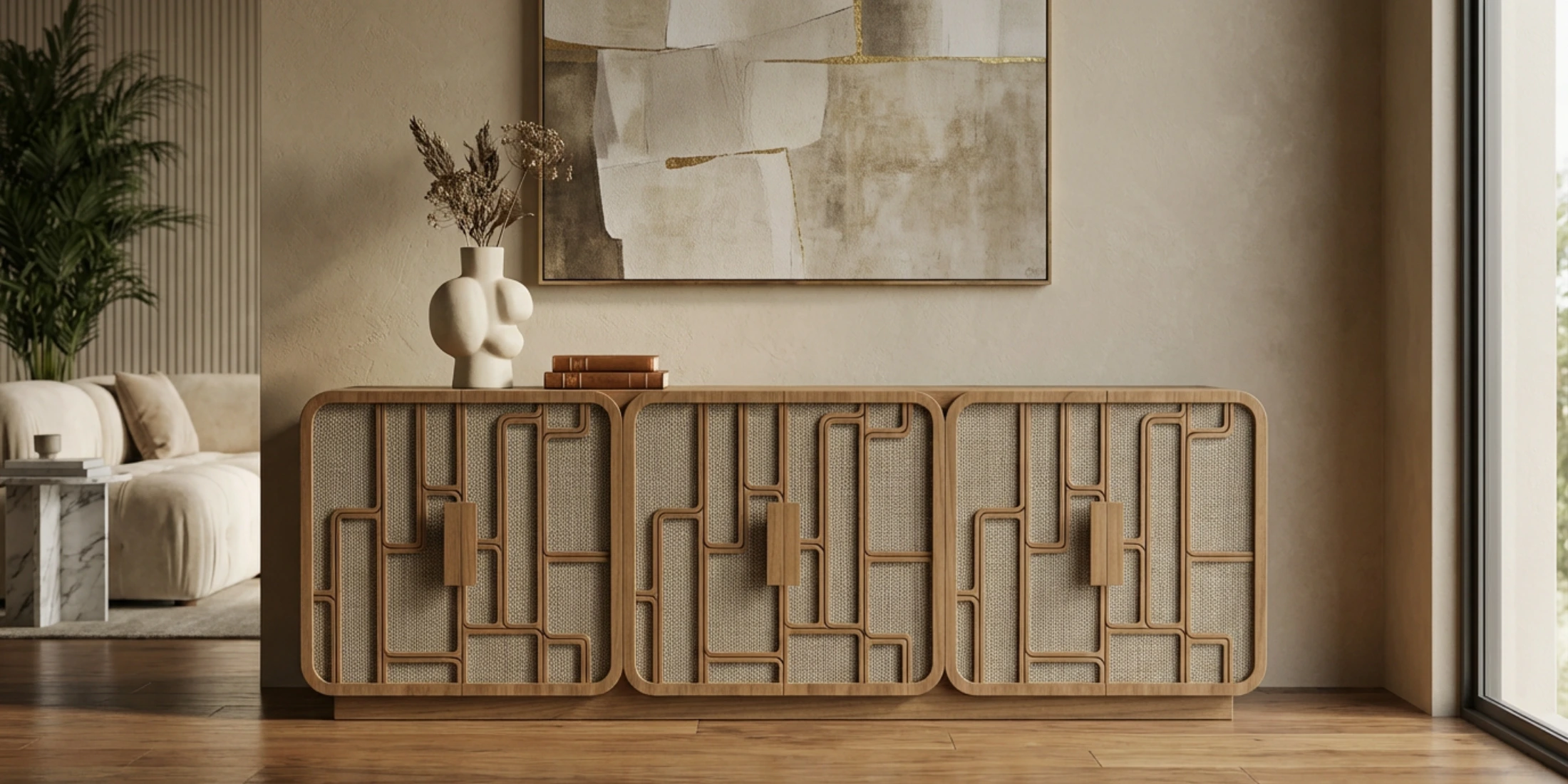 Its profile supports a storage cabinet with pattern detailing, offering generous concealed storage while remaining visually disciplined.