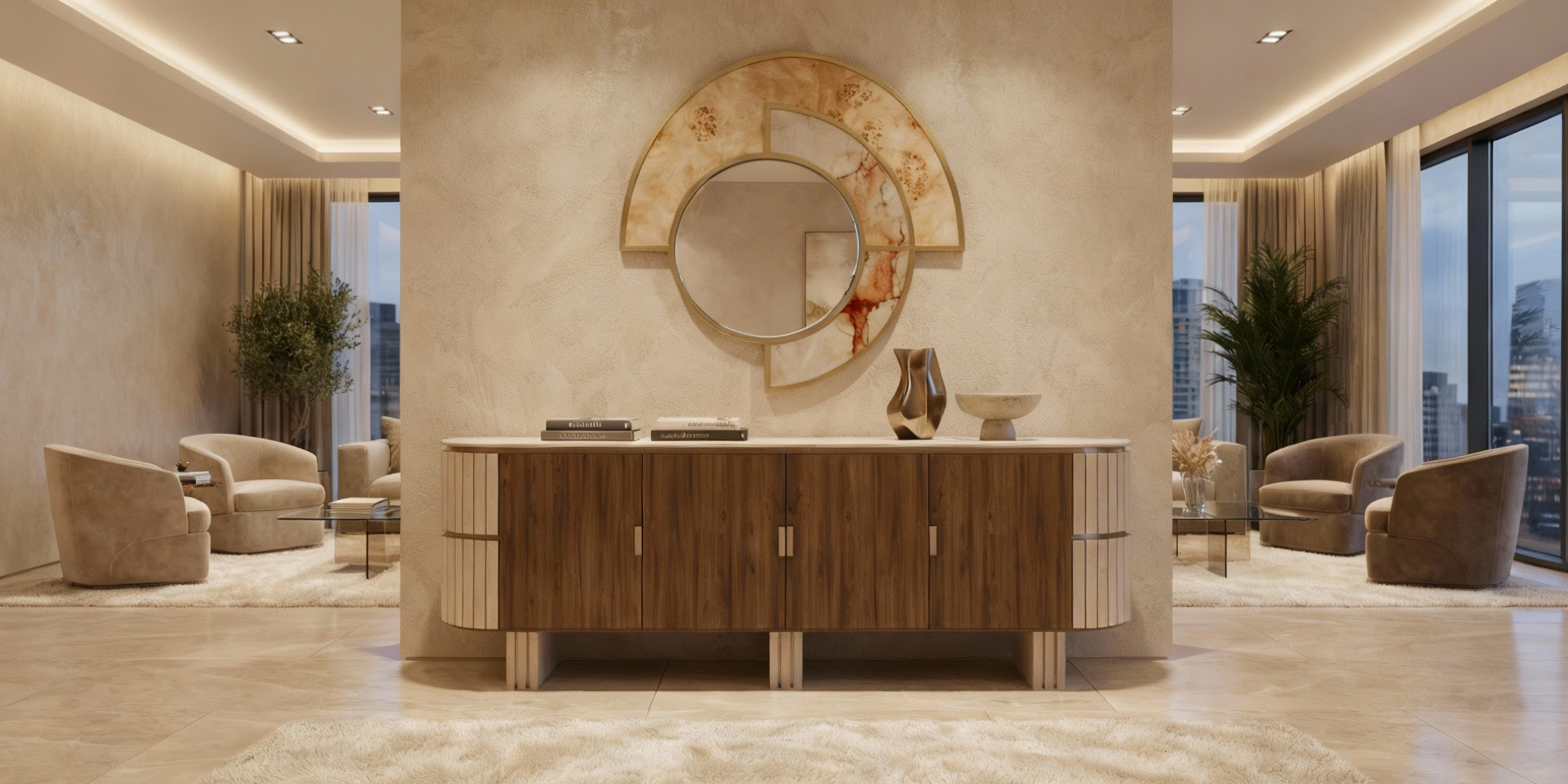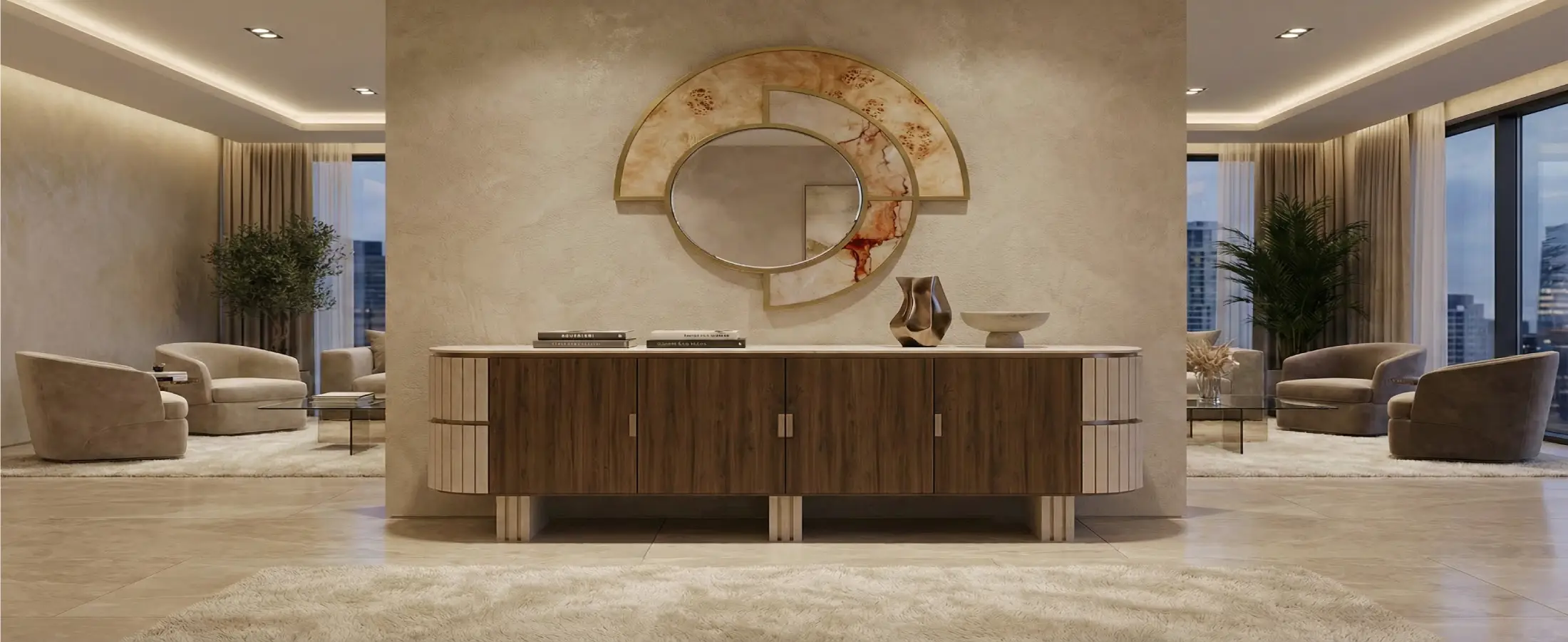 Its profile suits a designer buffet with stone top, offering tactile and visual depth while maintaining composure. The result is an elegant storage console.