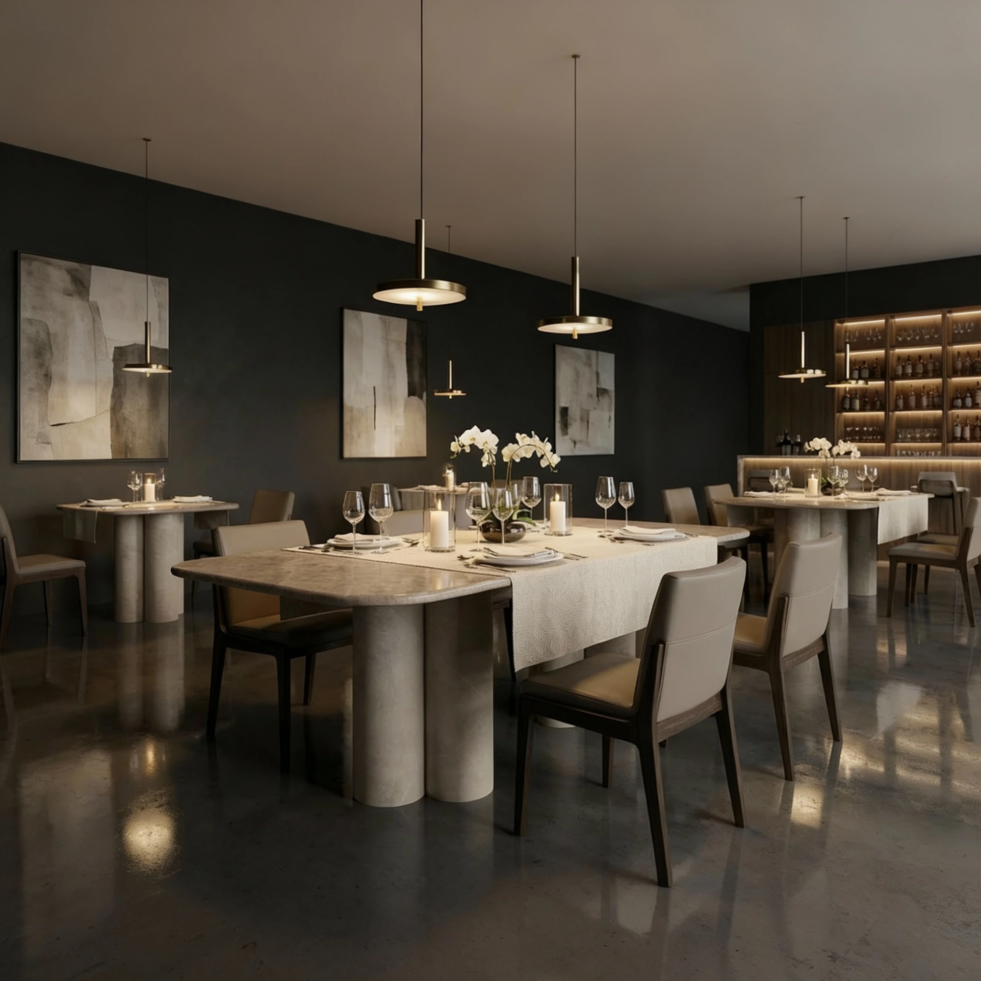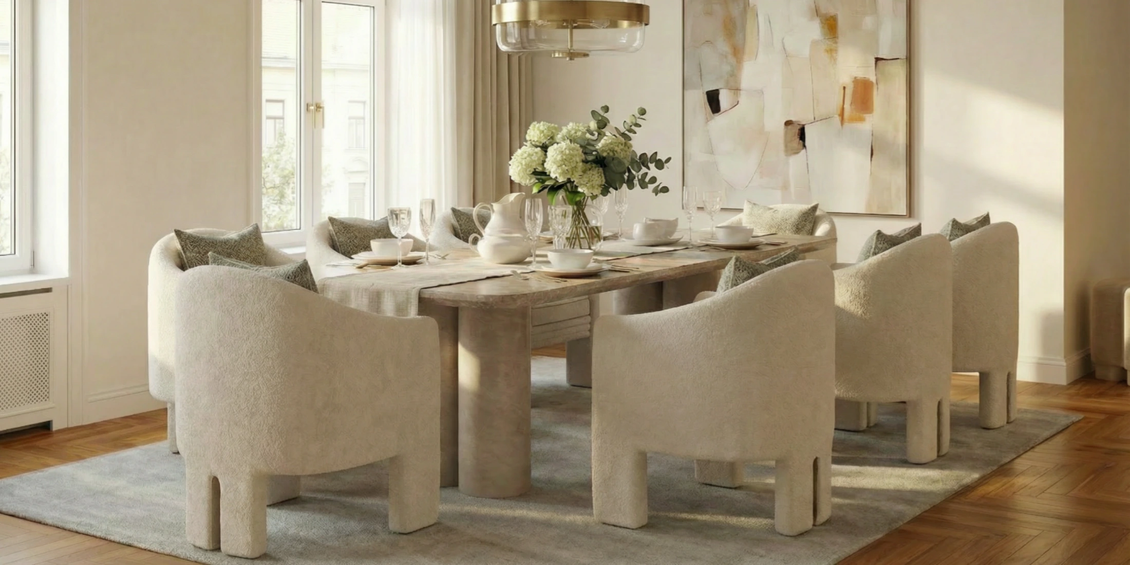 Its profile supports a handcrafted stone table for elegant dining spaces, offering visual and tactile depth. The composition reads as a minimalist designer table in warm marble.