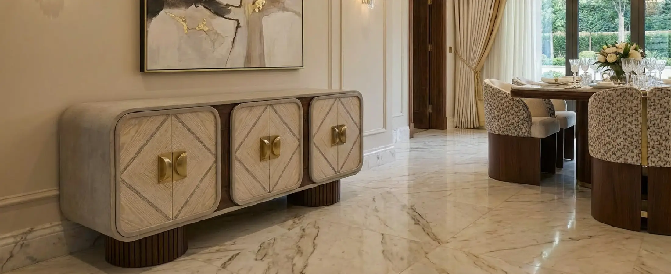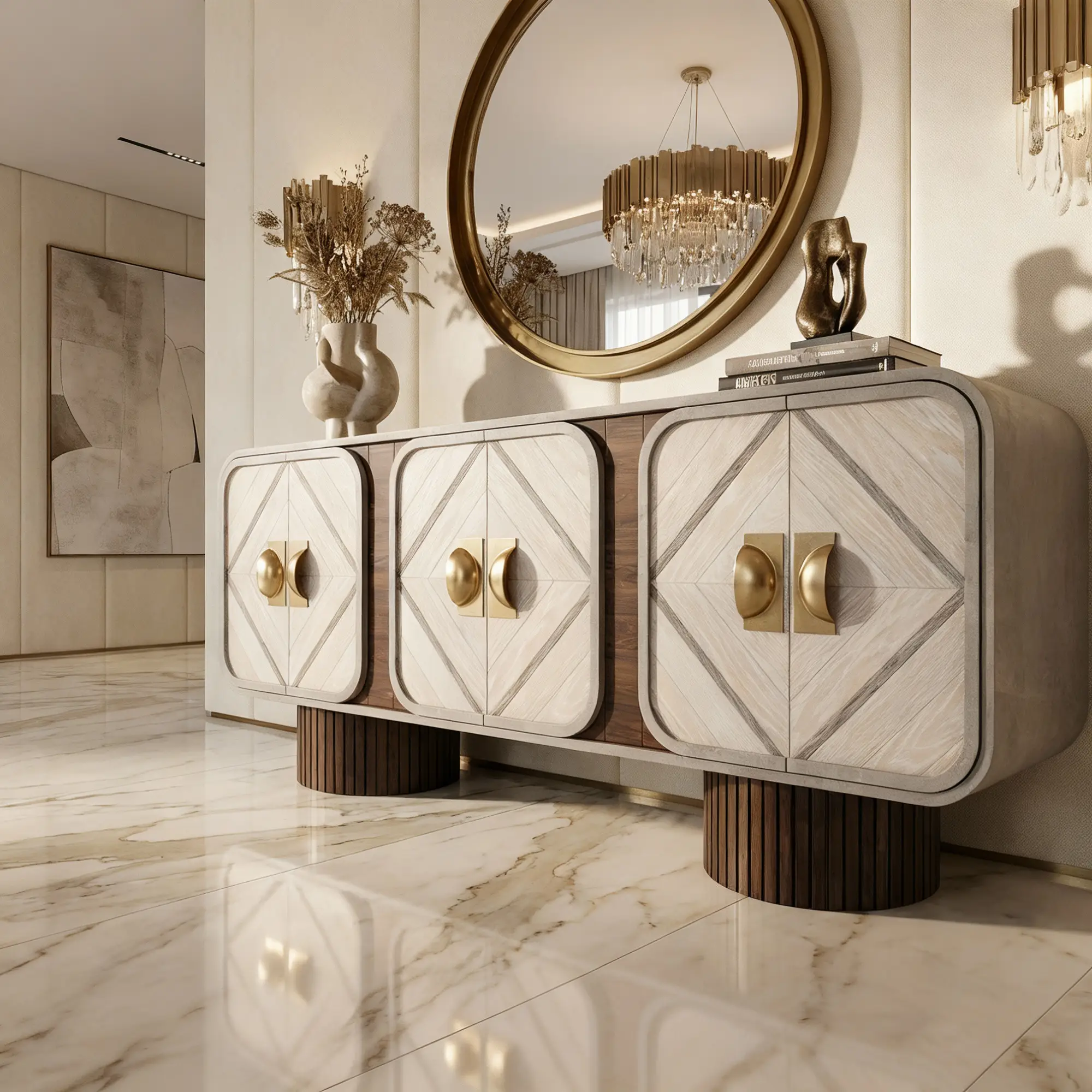 The Phillip Luxury Sideboard combines modern design with classic elements, featuring geometric doors, gold-tone handles, and rich wood accents.