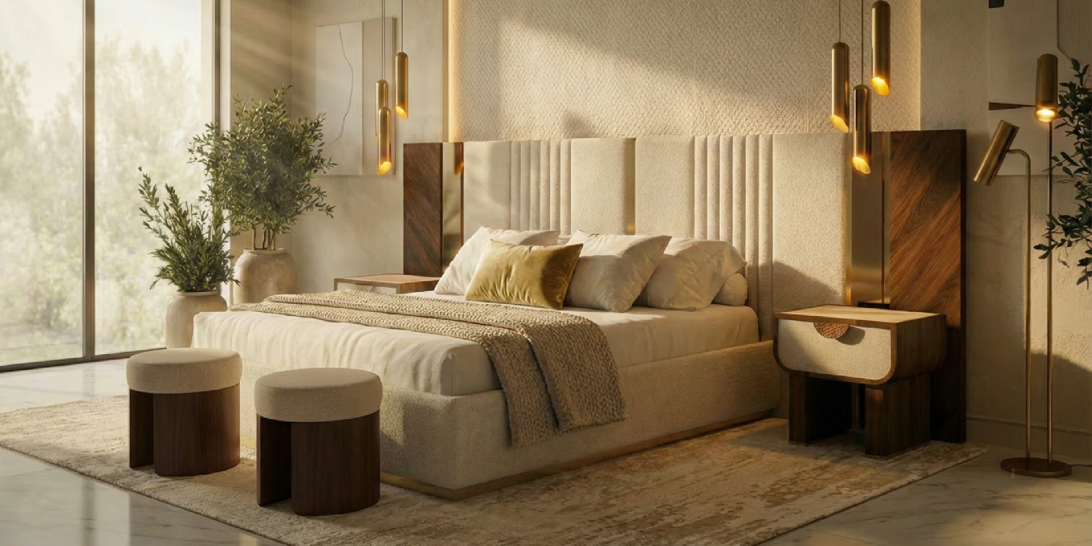 Pair with Sampson Bed to unify timber, stone, and upholstery in a considered bedroom vignette.
