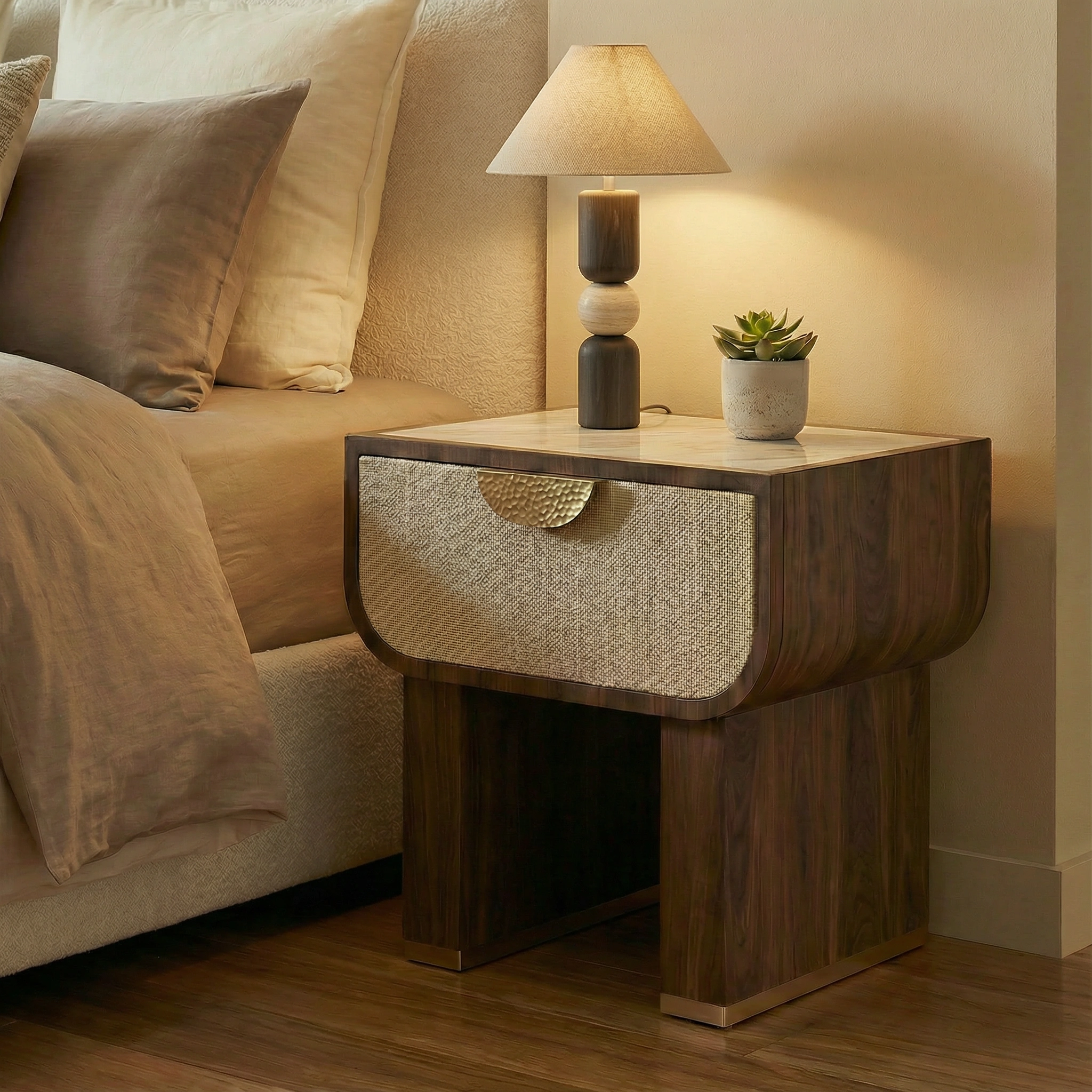 Rae Night Stand is a walnut and travertine nightstand, conceived as a compact architectural volume that anchors bedroom compositions with calm authority. Its silhouette balances proportion and presence.