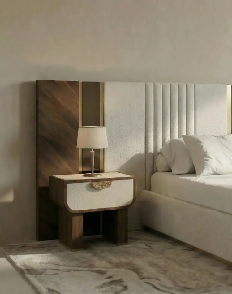 Its profile suits elegant bedside storage for contemporary interiors, offering visual and tactile depth.