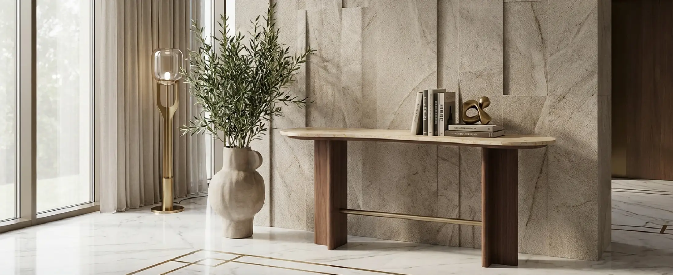 Scale and depth position it as an elegant console with stone top and wooden legs, suited to modern hallways that require a quiet but considered anchor. The result reads architectural and materially precise.