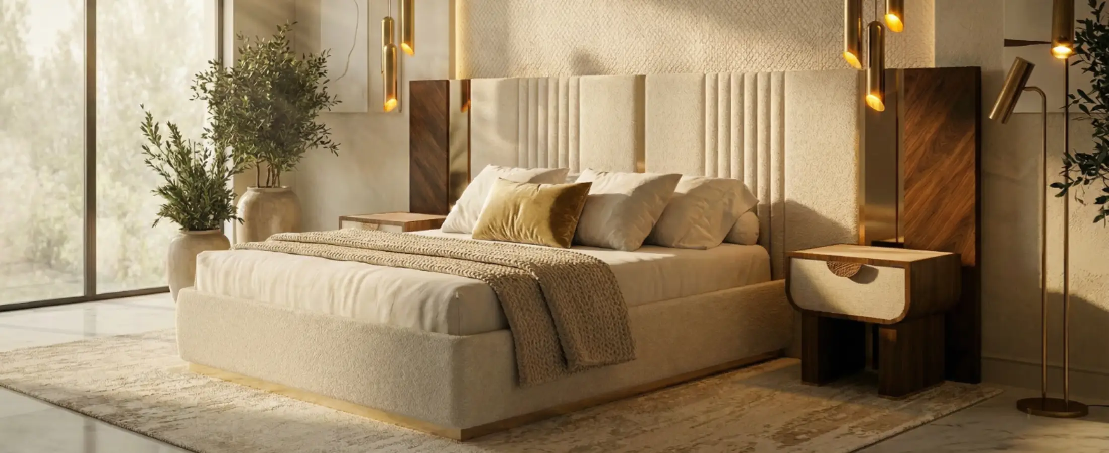 Sampson Bed asserts a composed presence in the bedroom as a velvet and walnut bed with brass accents, where upholstered comfort meets considered timber detail. The paneled headboard organises the wall and sets a calm rhythm.