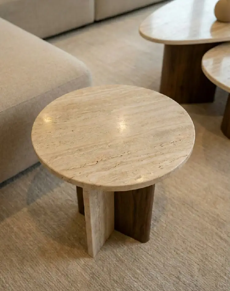 Isa Side Table is a travertine and walnut side table, conceived as a compact sculptural volume that anchors seating or bedside arrangements with quiet authority. Its round silhouette balances presence and proportion.