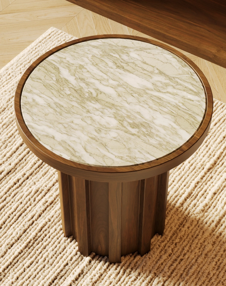 Selene Side Table is a walnut and Persian green marble side table, conceived as a round sculptural volume that anchors interiors with calm authority. Its fluted silhouette balances form and presence.