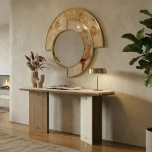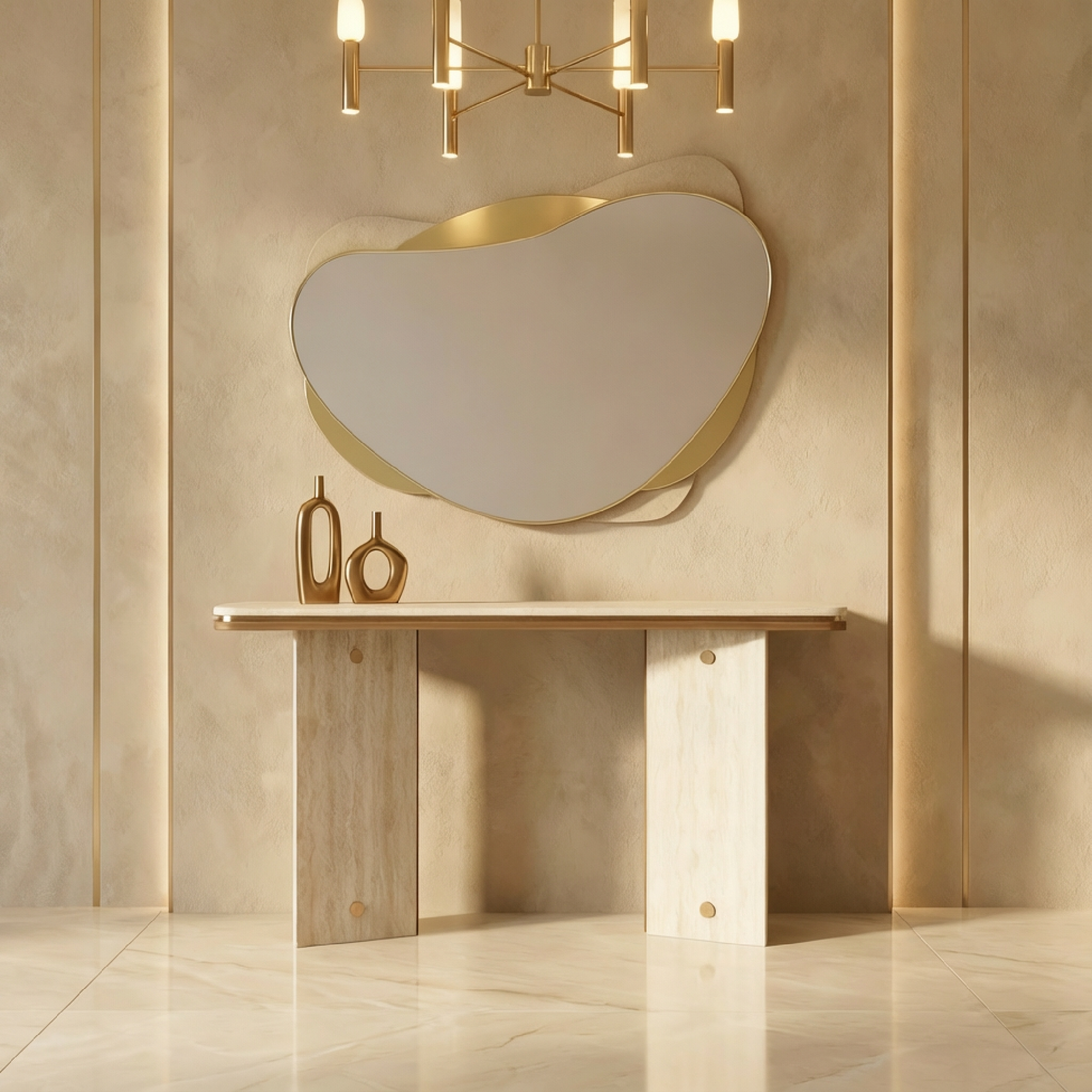 The Anti Mirror features an abstract shape that seamlessly integrates with its luxurious materials.