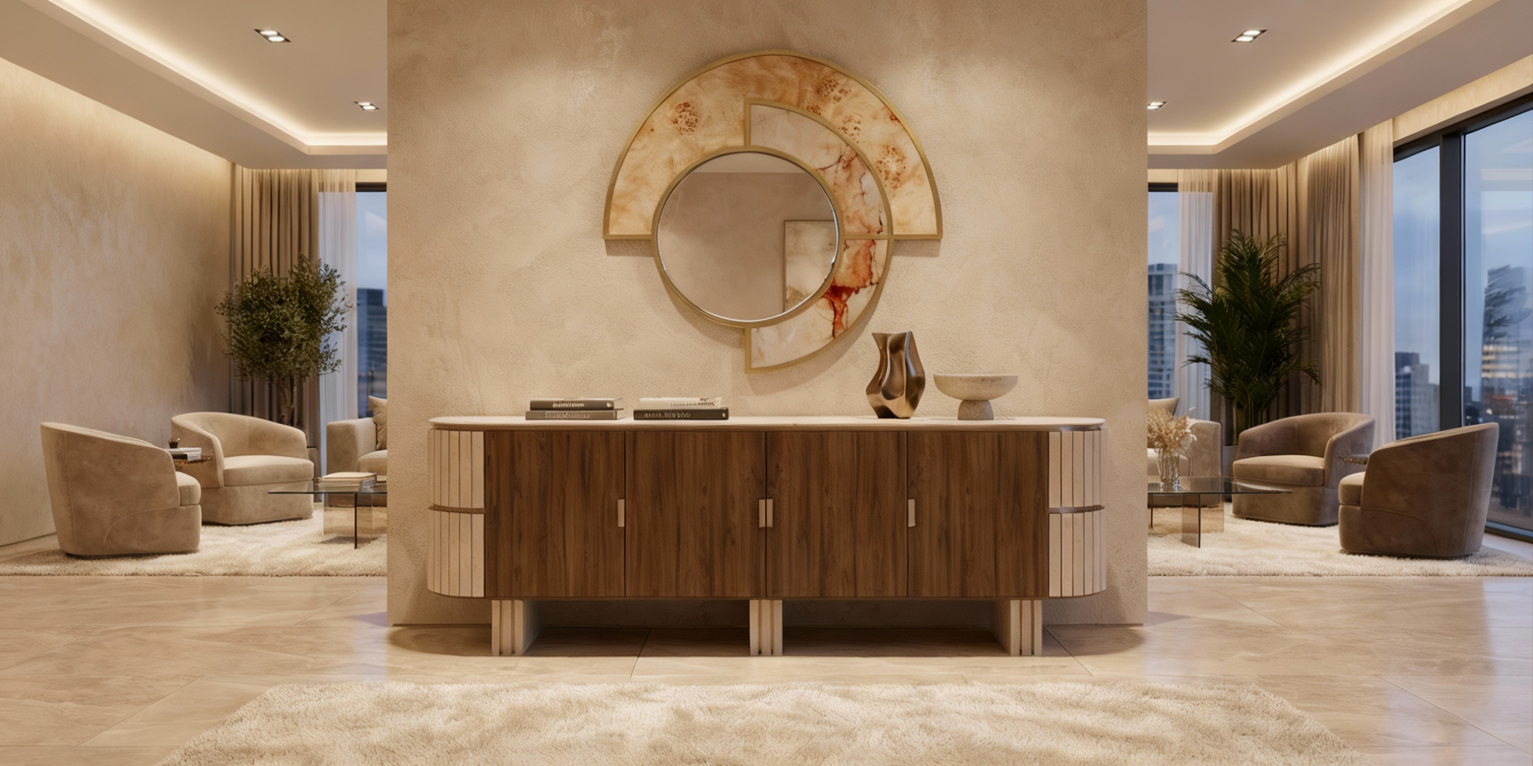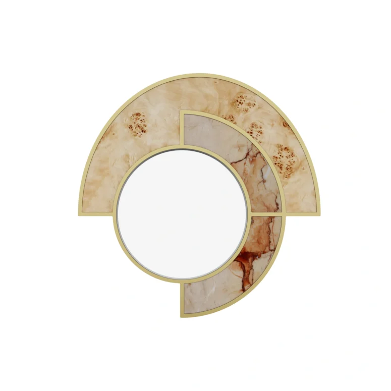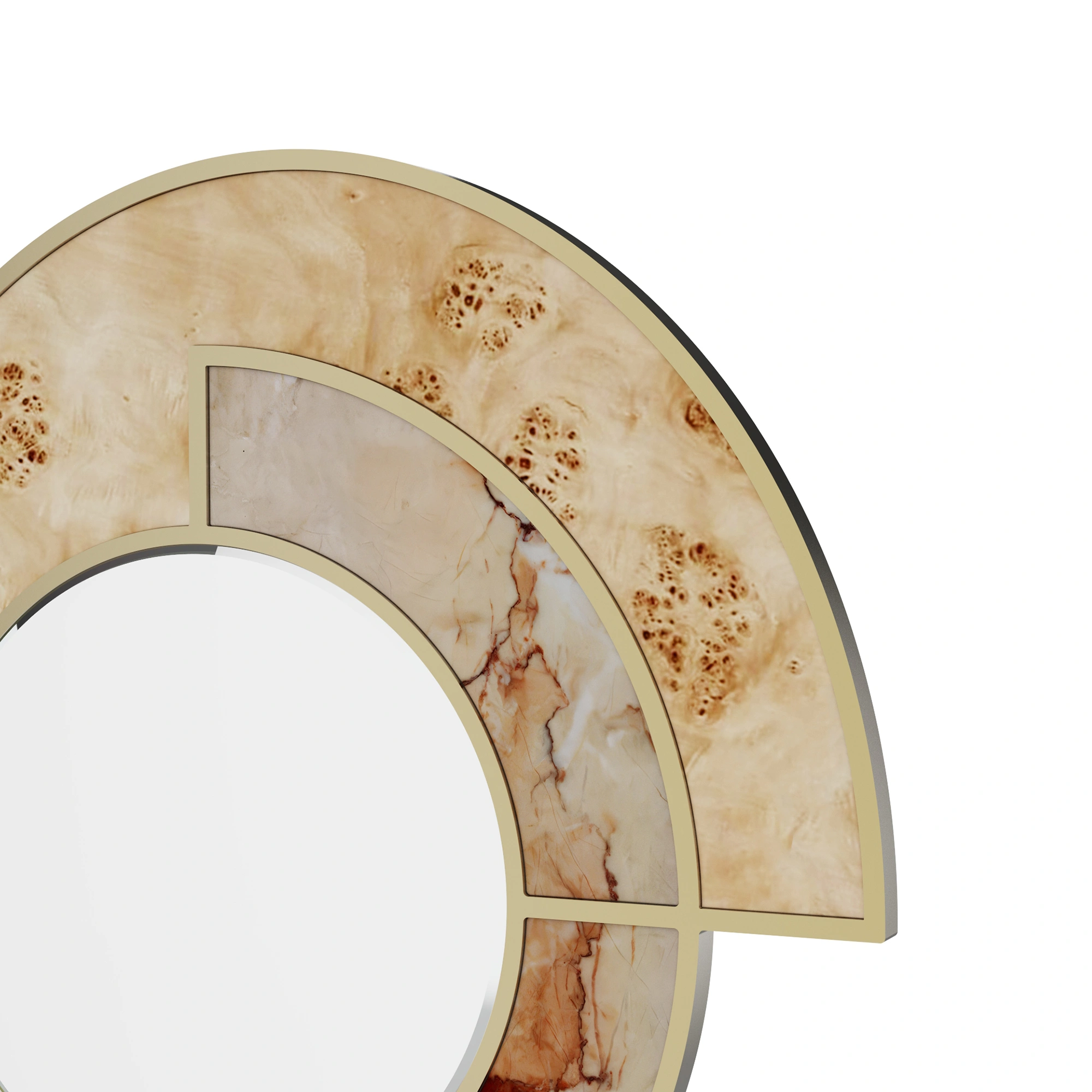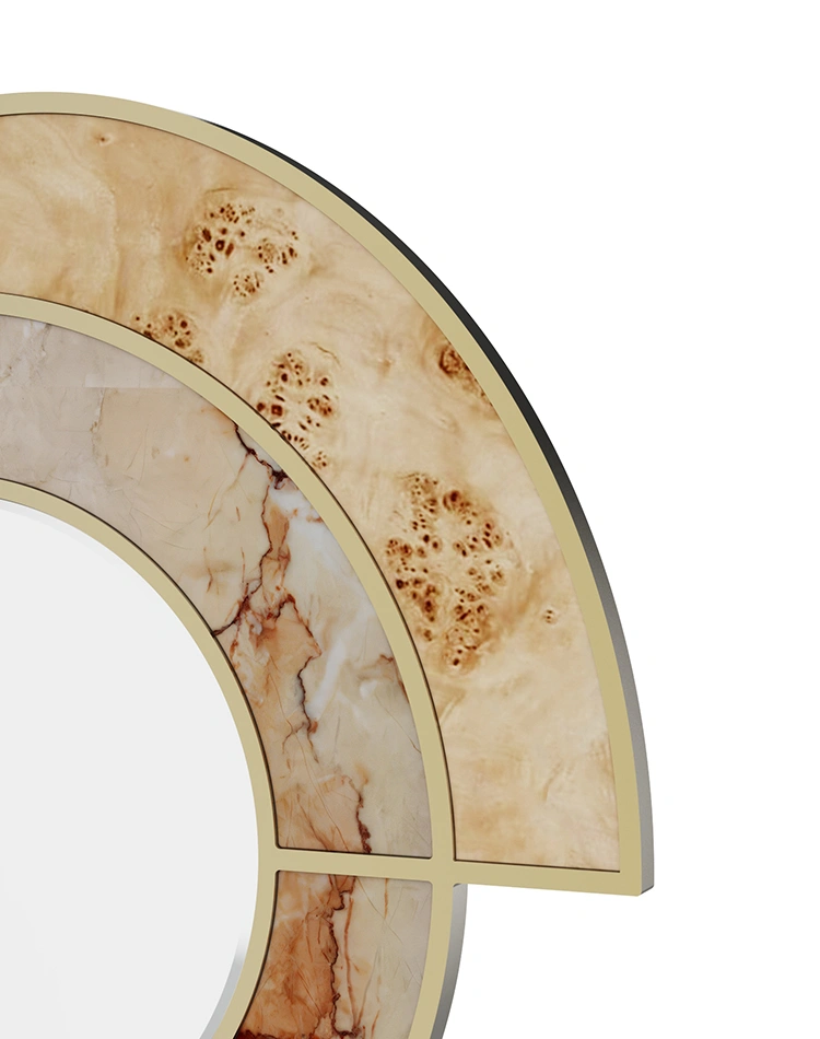The distinctive feature of the Sierra Mirror is its sculptural mix of burl wood, marble inlays, and brass accents, creating a layered frame that blends elegance and functionality in one striking piece.