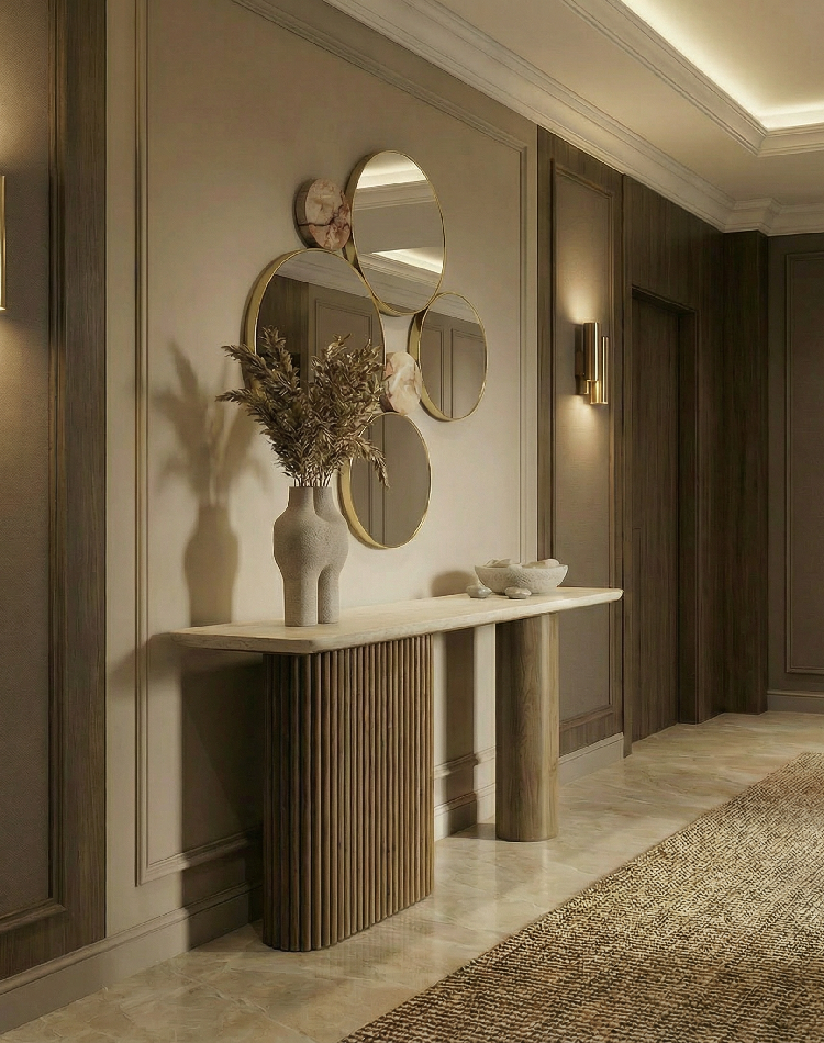 Pair with Livia Console to build a layered composition of stone, metal, and storage volume along the same wall, keeping the vignette unified yet nuanced.