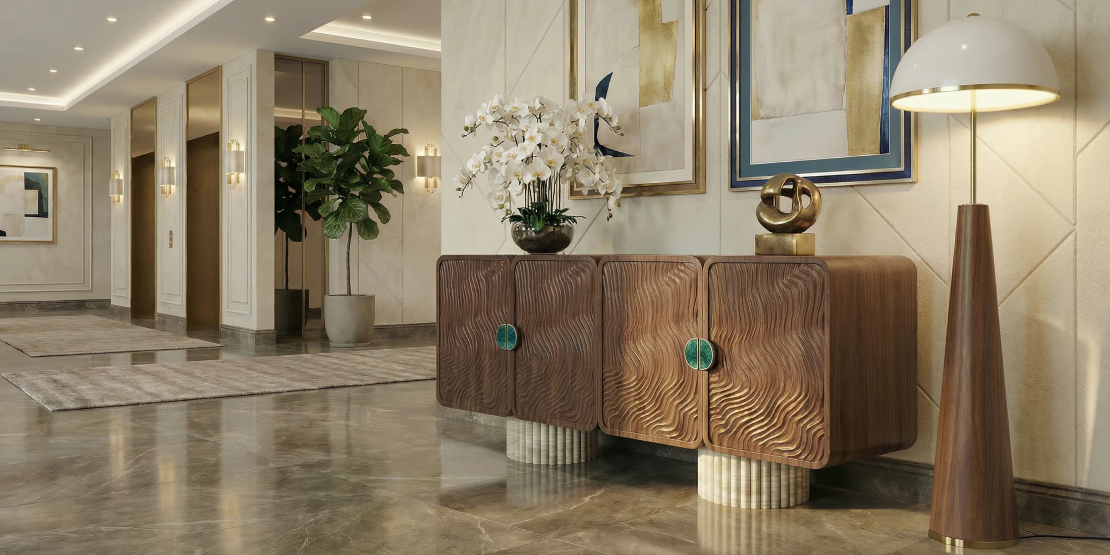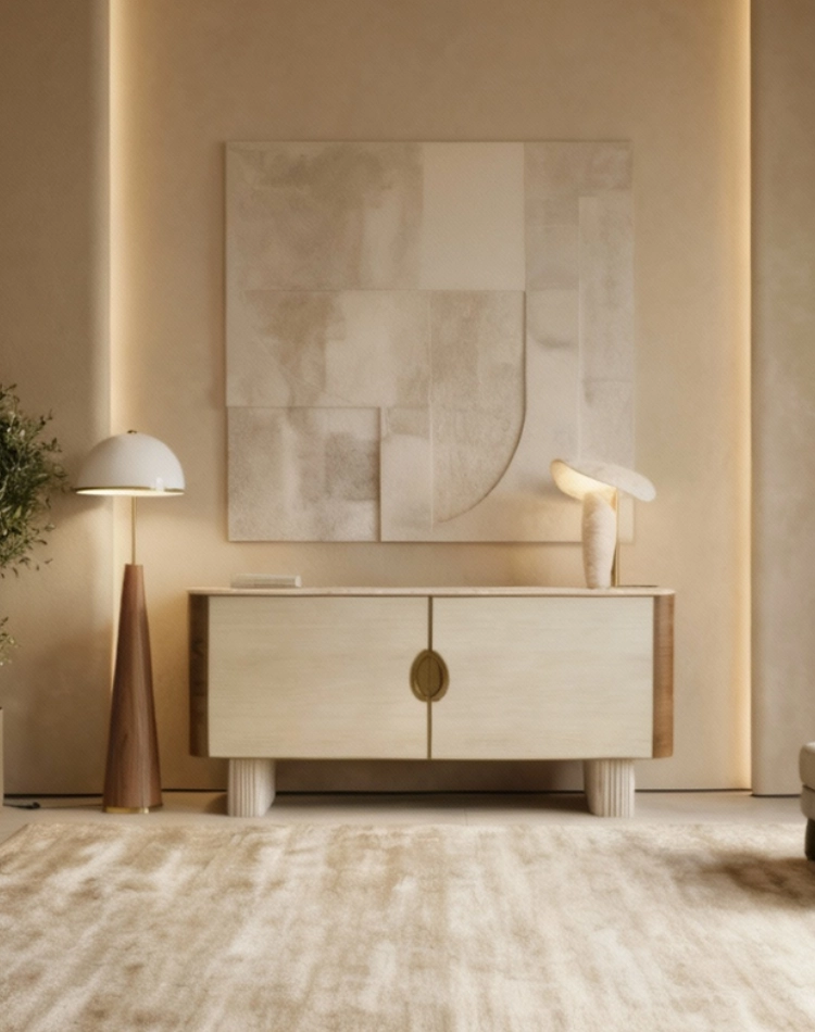 Illumination spreads from the dome into a soft, even glow, giving the lamp a calm presence beside seating, consoles, or circulation zones. The sculptural silhouette reads clearly from a distance, yet remains gentle in close view.