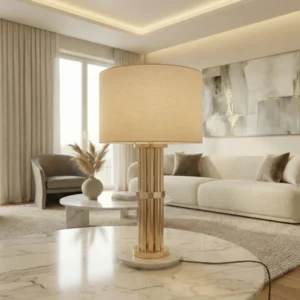 Above, a tailored fabric shade softens the geometry and settles light into a warm, even glow. The lamp’s sculptural profile holds presence from a distance yet remains unobtrusive alongside books, trays, and small objects.