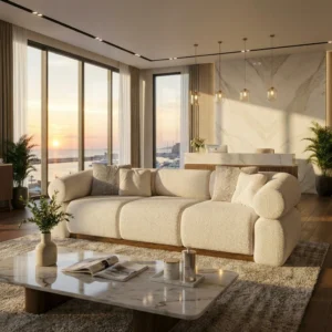Comfort is layered but disciplined: the supportive wrap, generous pillows, and balanced height encourage relaxed conversation without slouch. The piece holds a room with quiet confidence, suiting spaces that favor organic lines over hard edges.