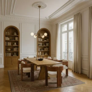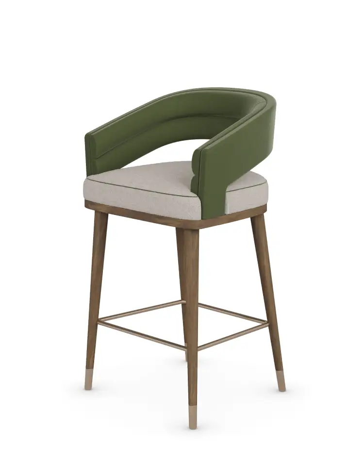 Crafted in matte walnut with polished brass details, Ava balances refinement with everyday durability: tapered legs finish in discreet metal caps and a brushed footrest that catches the light without shouting. The palette reads calm and premium alongside stone counters and warm timber.