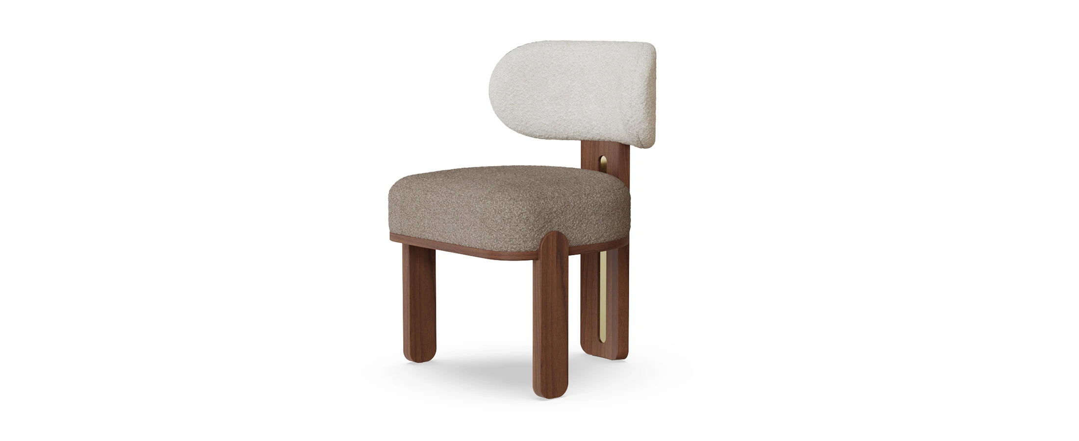 Blending contemporary elegance with luxurious comfort, the Diane Dining Chair features walnut wood, bouclé and brass, a refined statement piece for any dining setting.