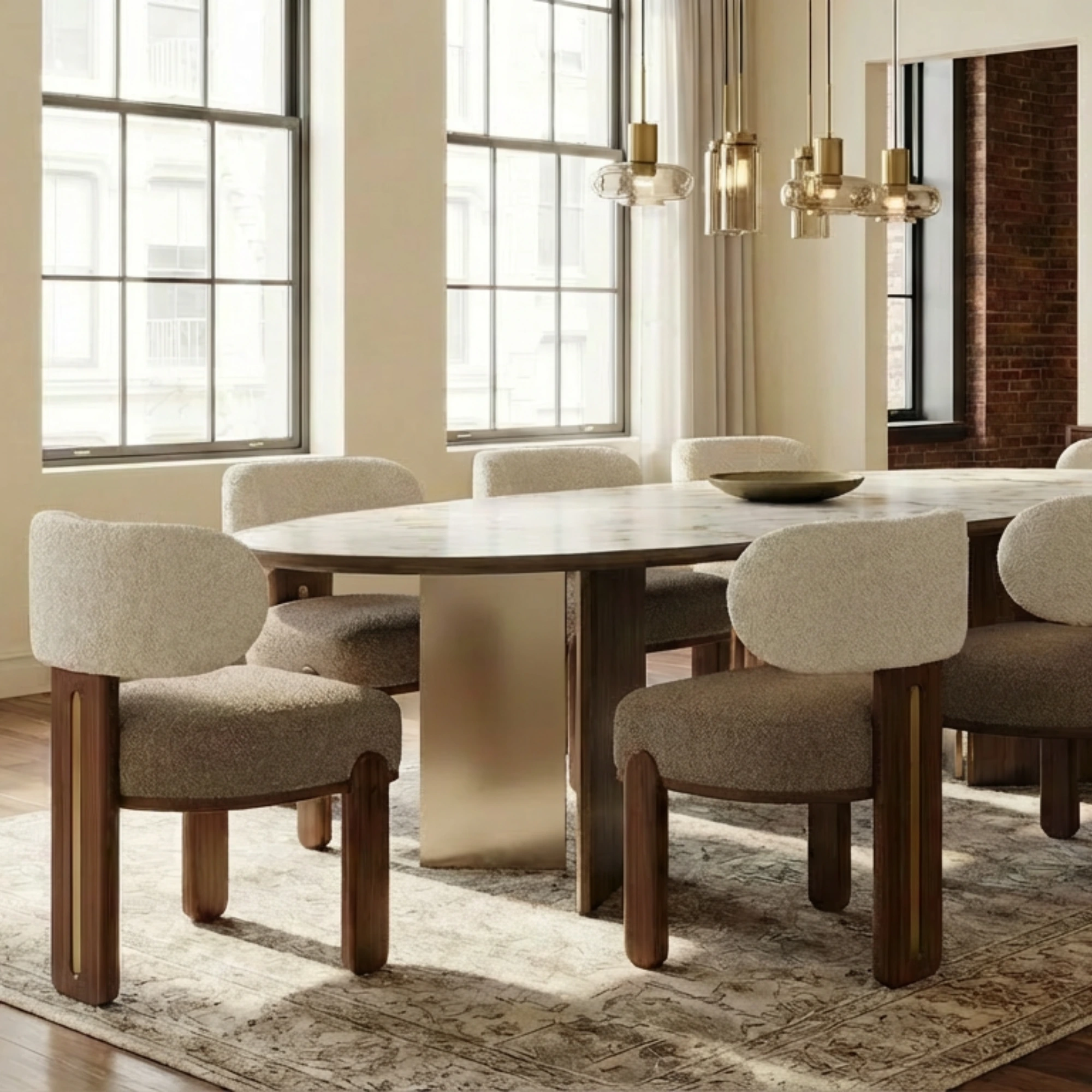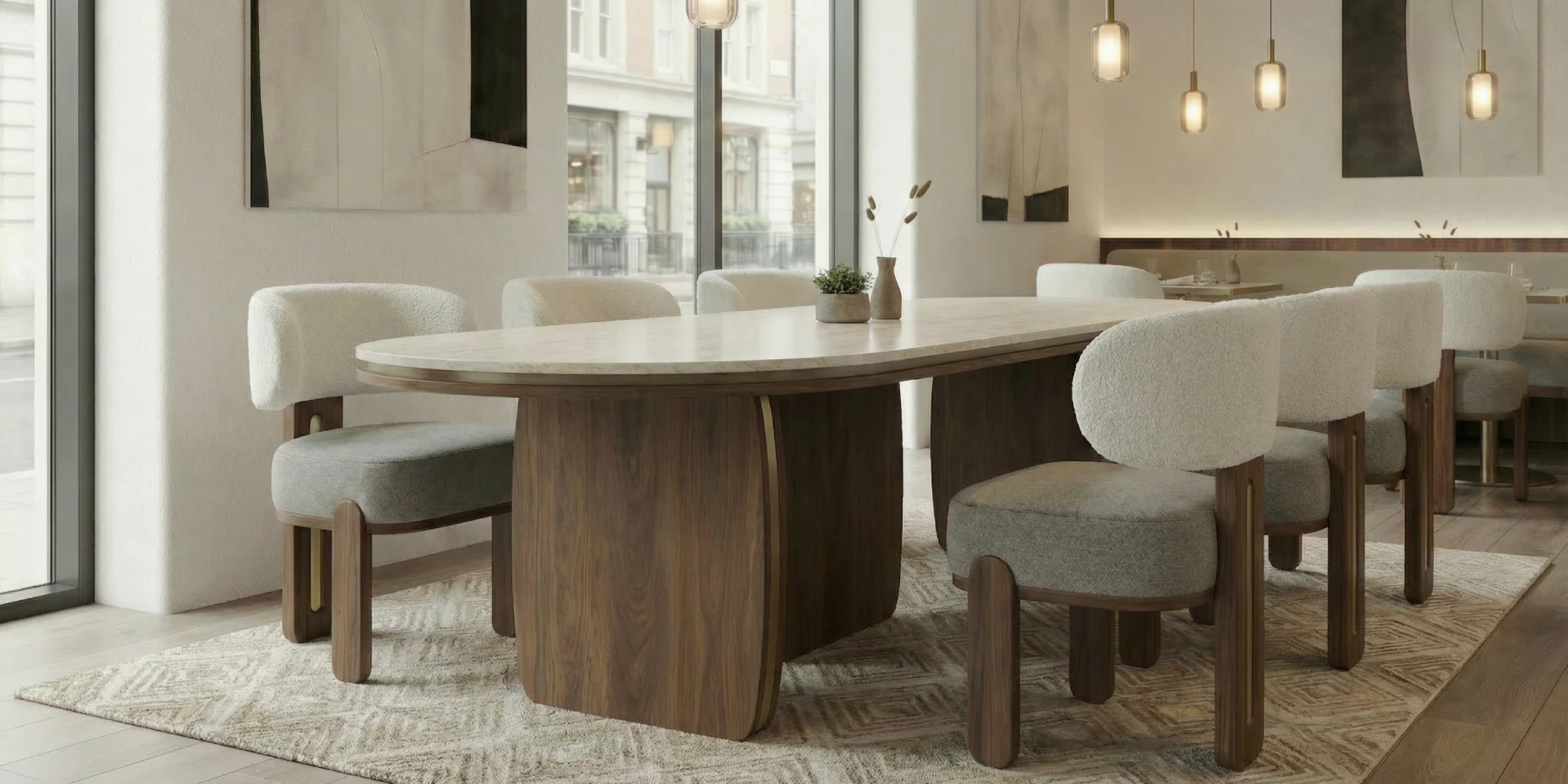 For the table, introduce Assia II Dining Table. Its travertine top with a sculptural walnut base echoes Diane’s palette and vertical nature, creating a unified stone-and-timber story across the setting.