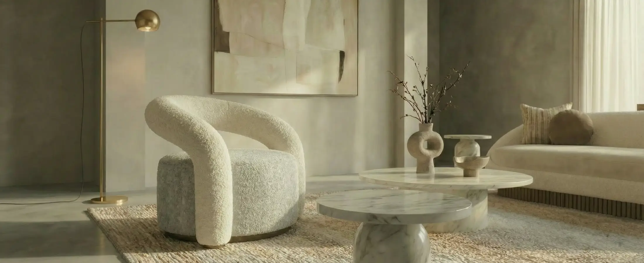 The interior is tailored in luxurious bouclé upholstery for tactile depth, set on a low walnut plinth that lifts the volume cleanly from the floor. Curves are controlled, seams precise, and the silhouette reads grounded, so it sits neatly in pairs or as a single accent.
