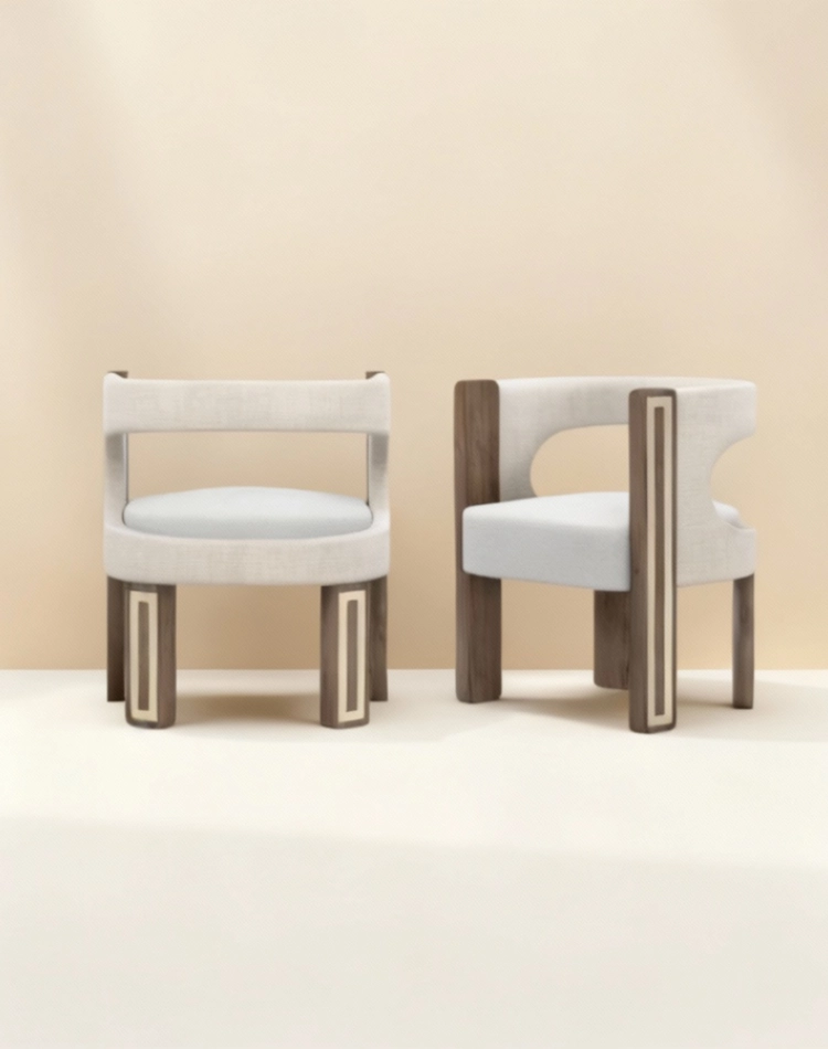 Goldie is a velvet dining chair with a quietly graphic silhouette and a poised, contemporary stance. The crescent back opens into a refined cut-out that eases the shoulder line and keeps the profile light around the table.