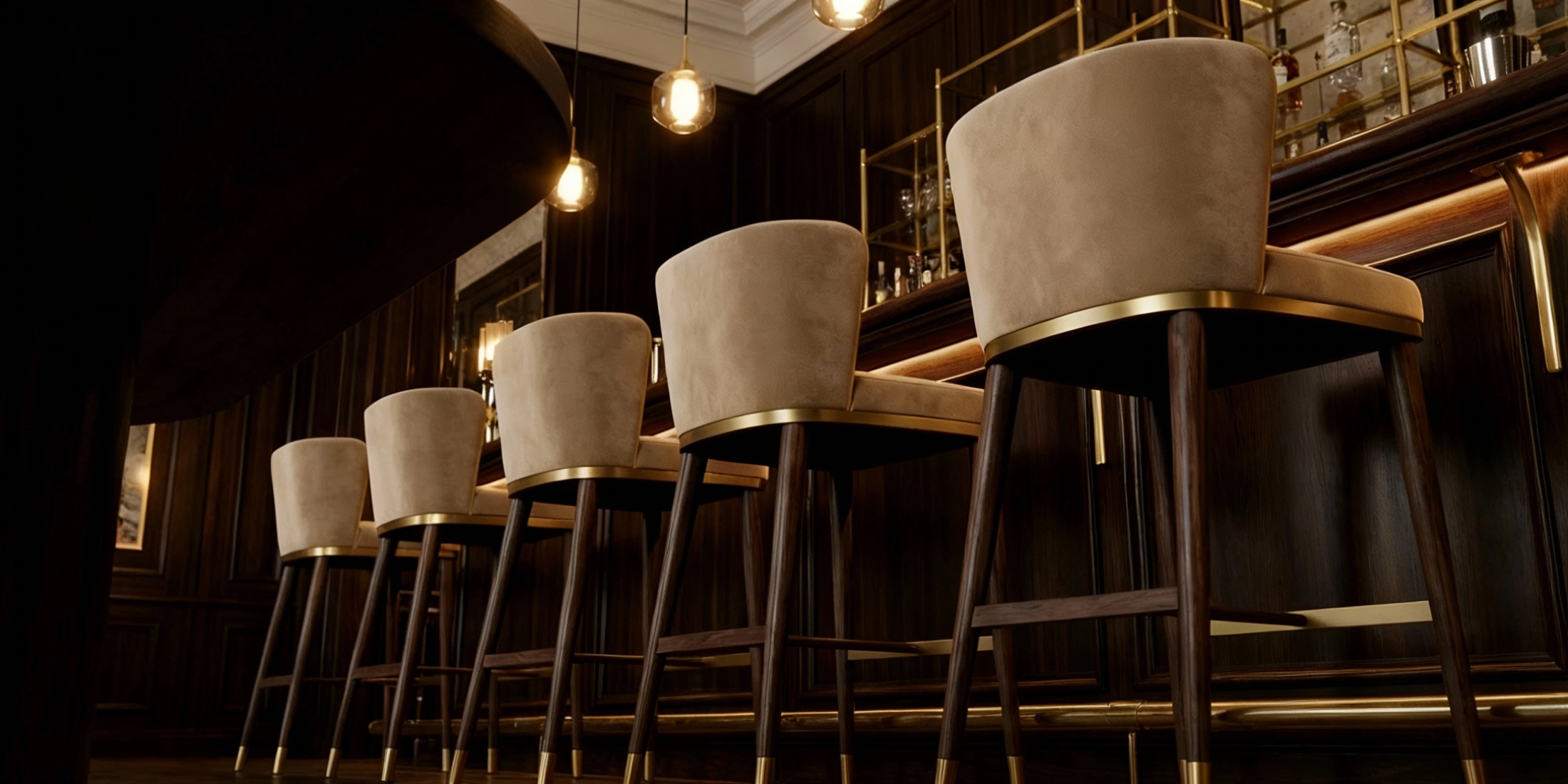 The Hazel Bar Chair is accented with brass-finished details, including a brass band around the base of the seat and brass-capped legs, adding a hint of glamour and modernity.