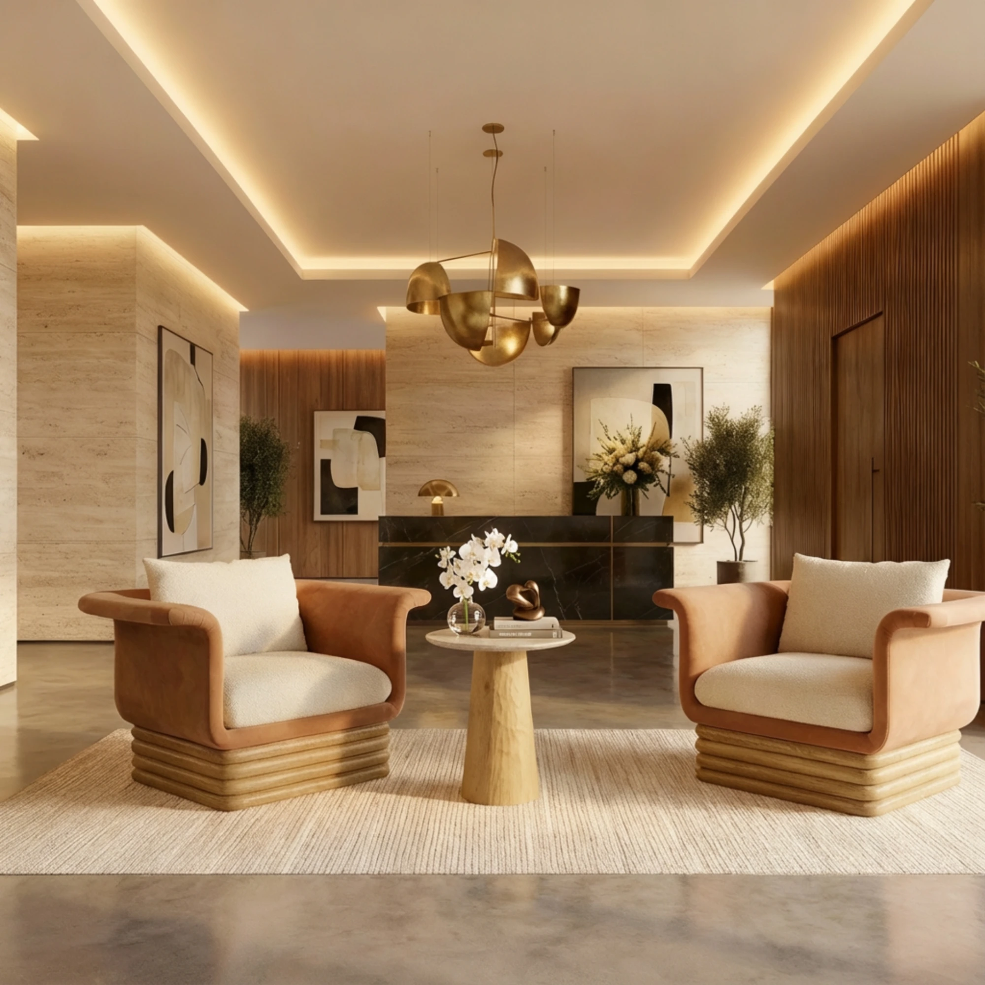 For a considered pairing, anchor the seating group with Amara Coffee Table. Its marble top and sculptural oak base echo Isabella’s mix of soft curves and strong materials, creating a cohesive focal point in the room.