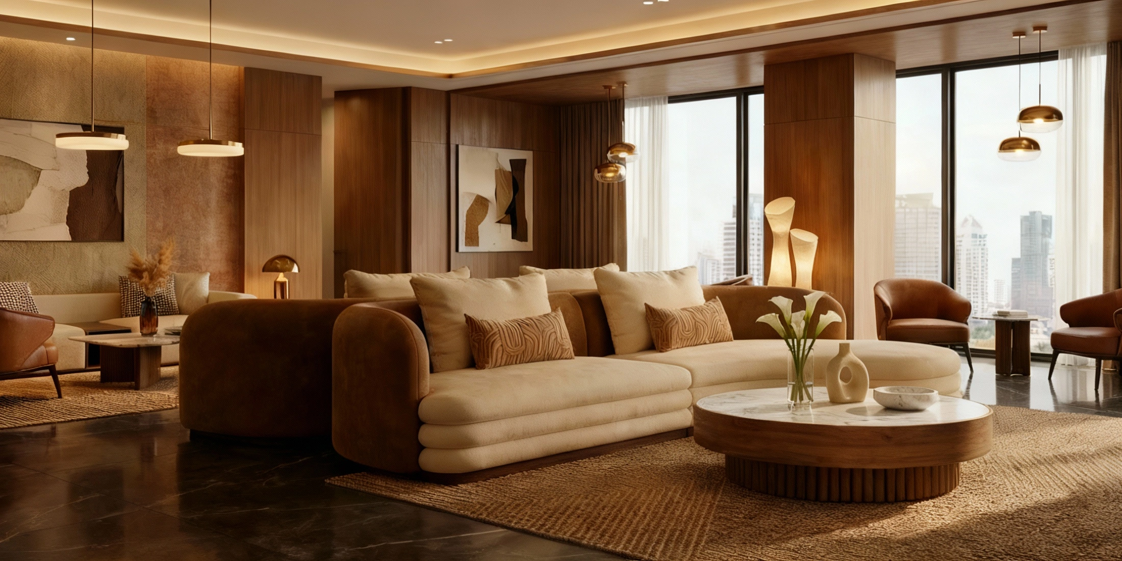 For a balanced arrangement, anchor Latte with Matti Coffee Table. Matti’s honed travertine top and ribbed walnut base pick up the sofa’s tones and curves, creating a quiet dialogue of stone, timber, and textile at the centre of the room.