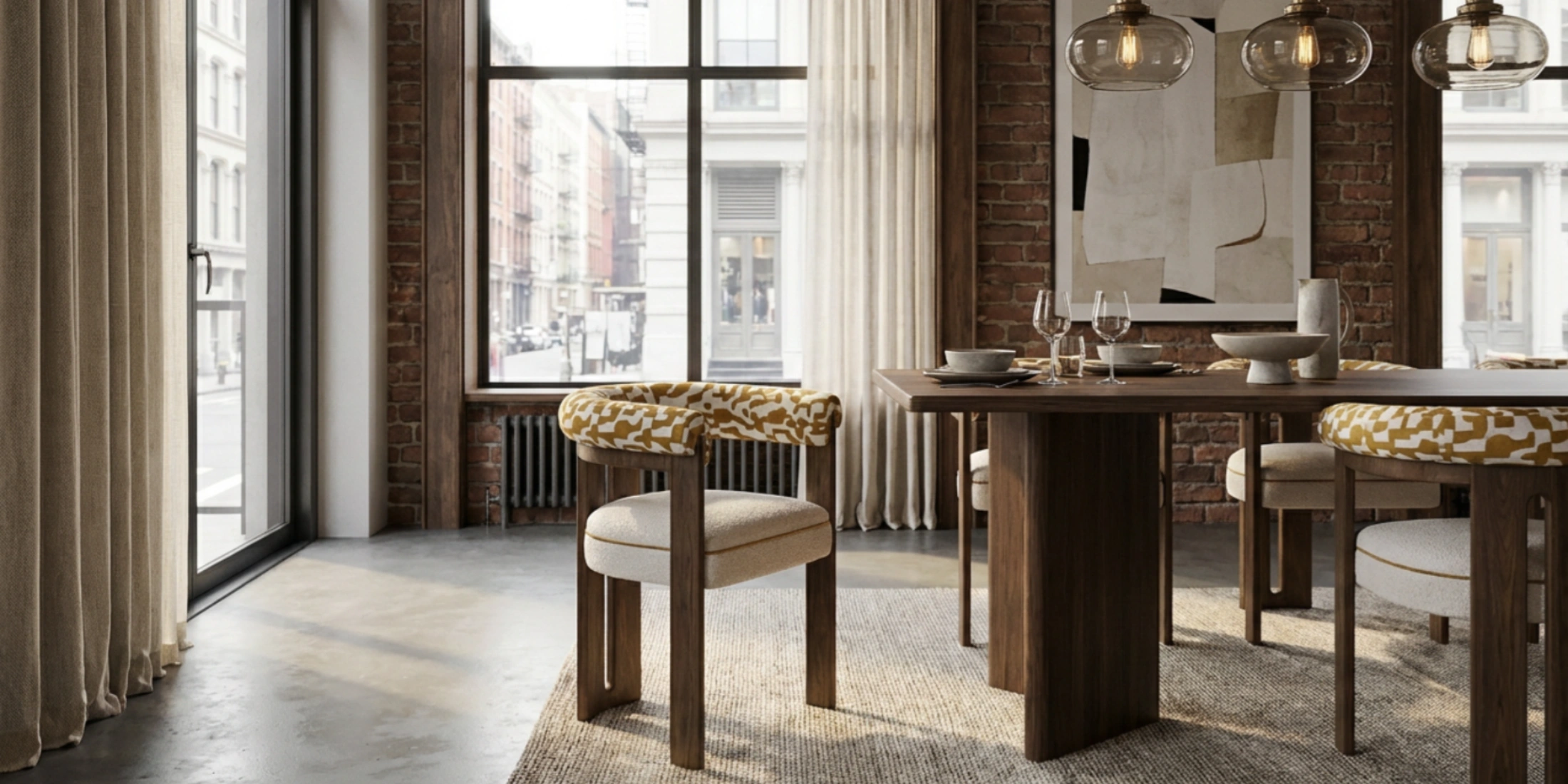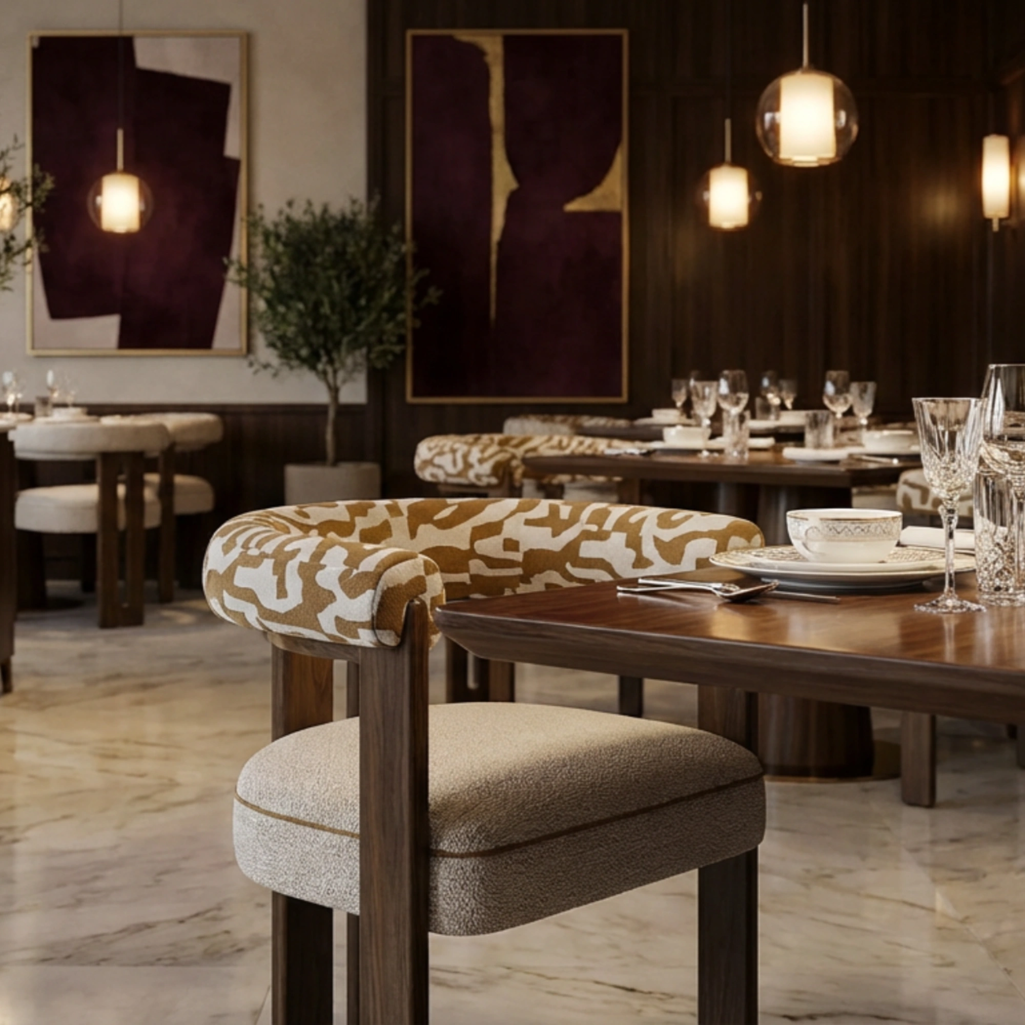 Comfort is tuned for long meals: cushioning is generous but controlled, and the supportive wrap of the back holds posture without feeling rigid. In multiples, the silhouette remains ordered, bringing a sense of rhythm rather than visual noise.