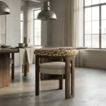 Mathilde features a unique three-leg walnut base and soft bouclé upholstery, blending modern flair with timeless charm. Perfect for any dining space, it offers both comfort and style for every occasion.