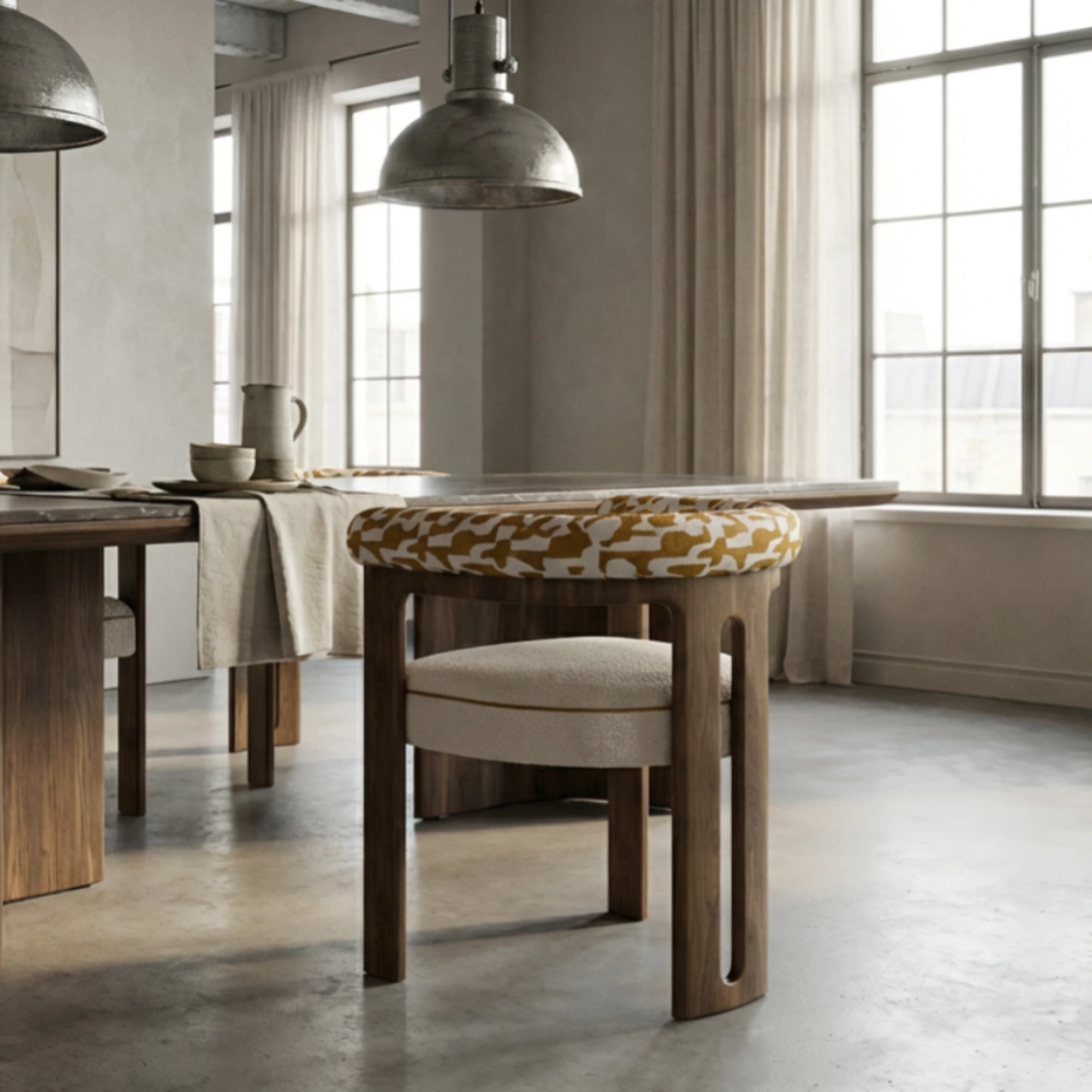 A bouclé upholstered seat and inner back introduce soft texture and depth, while the walnut legs keep the form warm and grounded. The contrast between tactile fabric and timber structure gives Mathilde the quiet confidence of a modern dining chair with a walnut base, equally at home in refined residential and boutique hospitality settings.