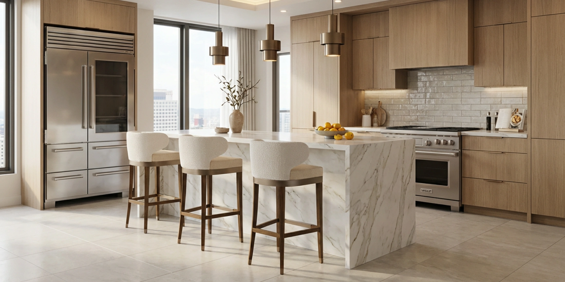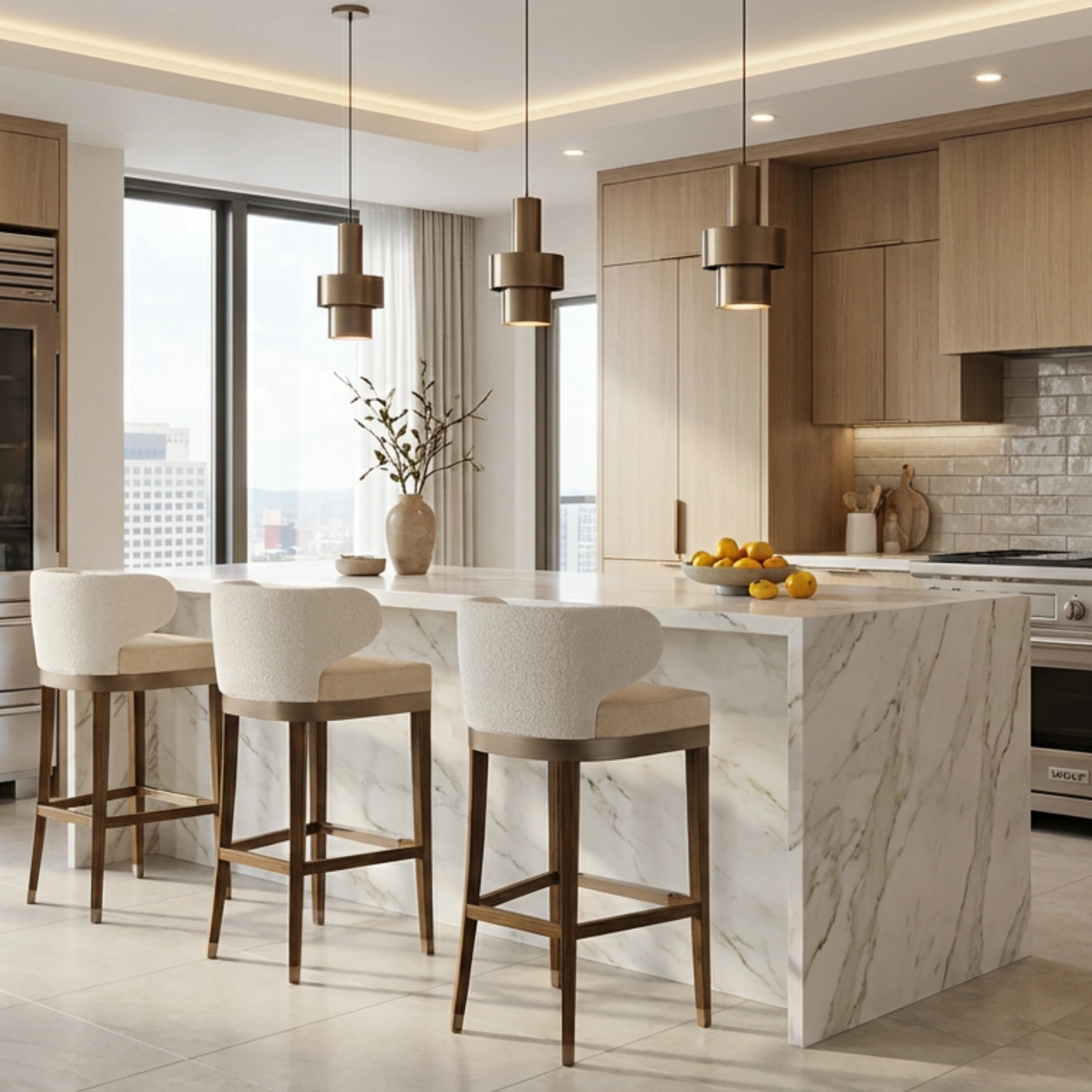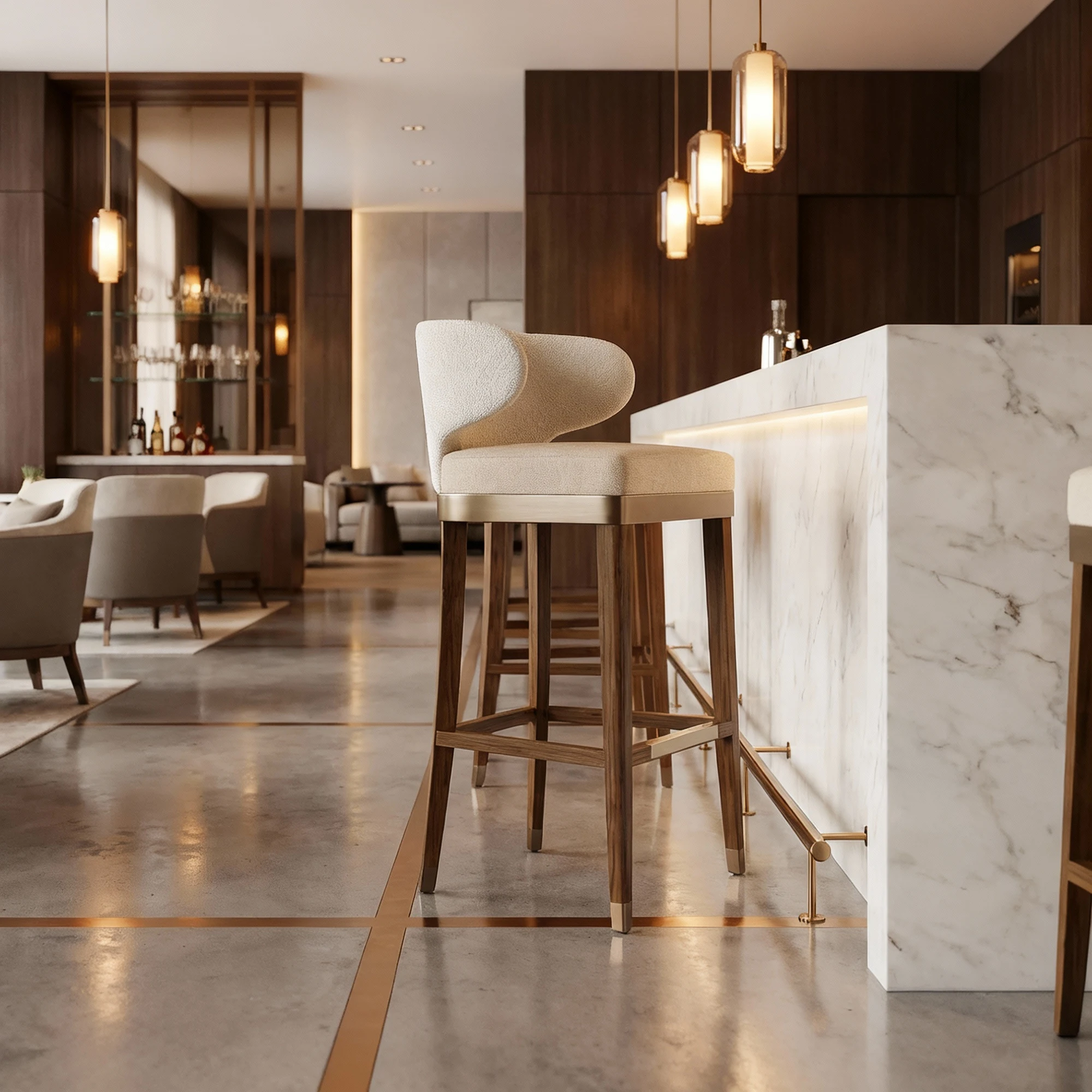 The Méredith Bar Chair by Nolita Harbour blends comfort and modern elegance, featuring a curved backrest, plush seat, and rich walnut frame, ideal for stylish contemporary spaces.