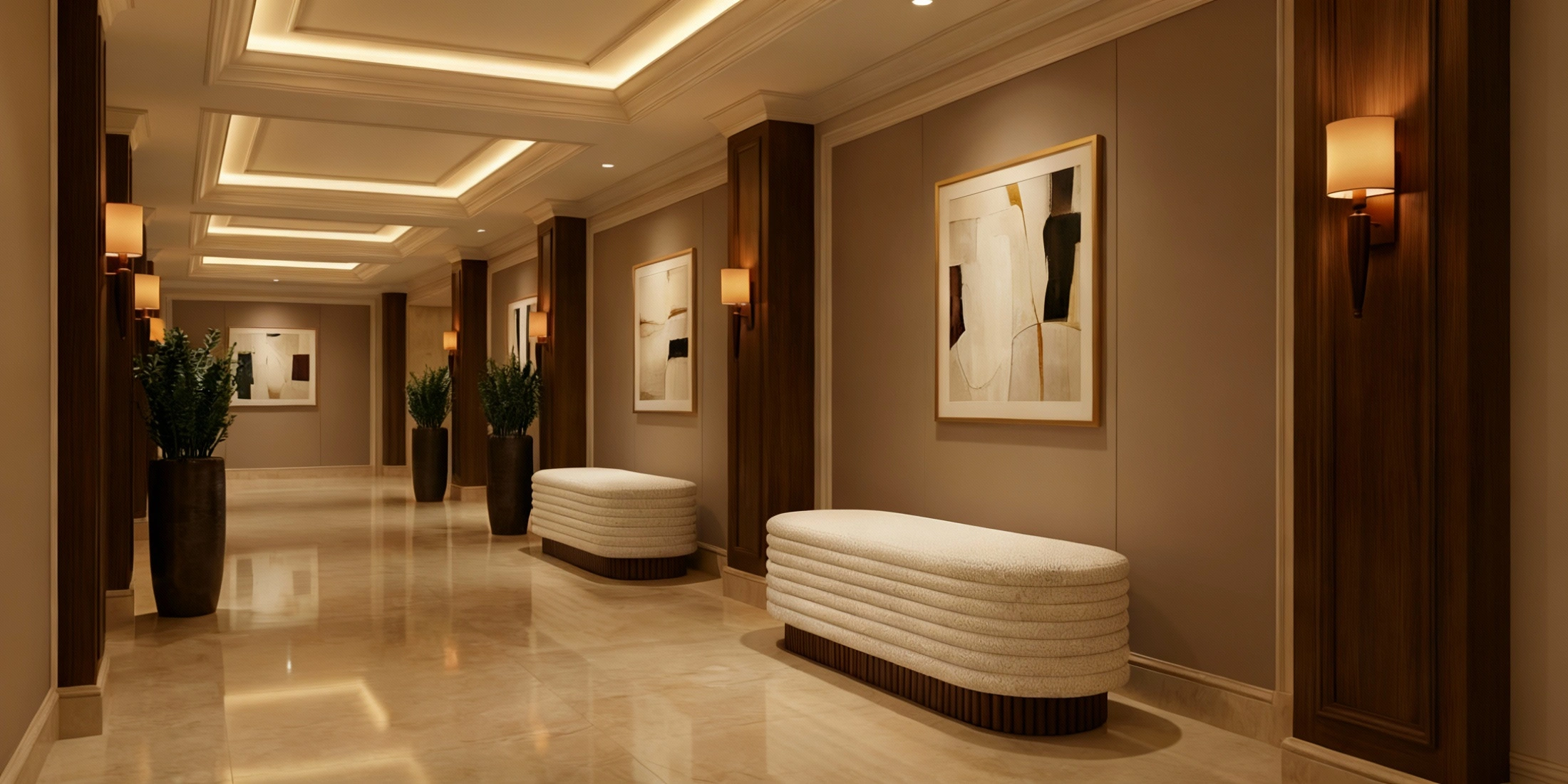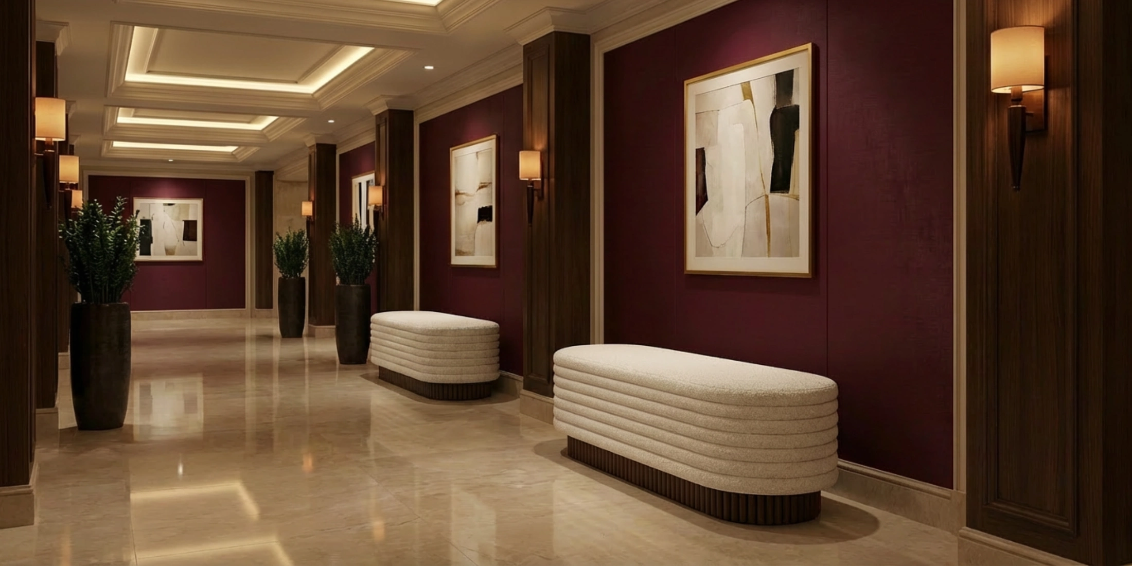 Proportions are tuned for everyday use, so the piece functions as an elegant upholstered bench rather than a casual perch. In an entry or corridor it behaves as a discrete luxury bench for hallway applications, while at the foot of a bed it completes the composition without visual noise.