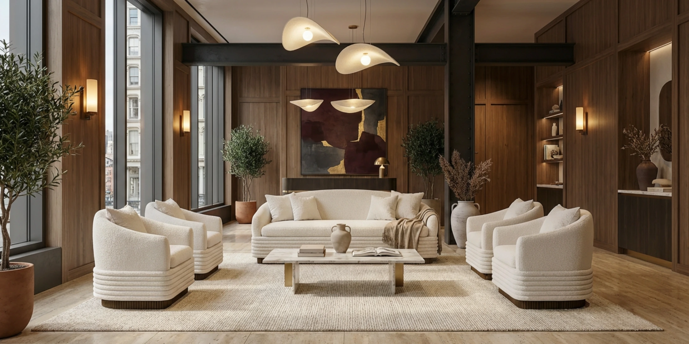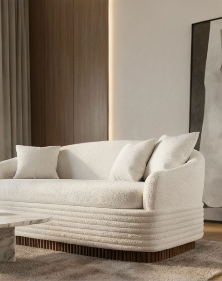 Nina Sofa is a bouclé upholstered sofa with walnut base conceived as a calm, linear anchor for contemporary living spaces. It reads as a modern luxury piece that sits within the architecture rather than in front of it.