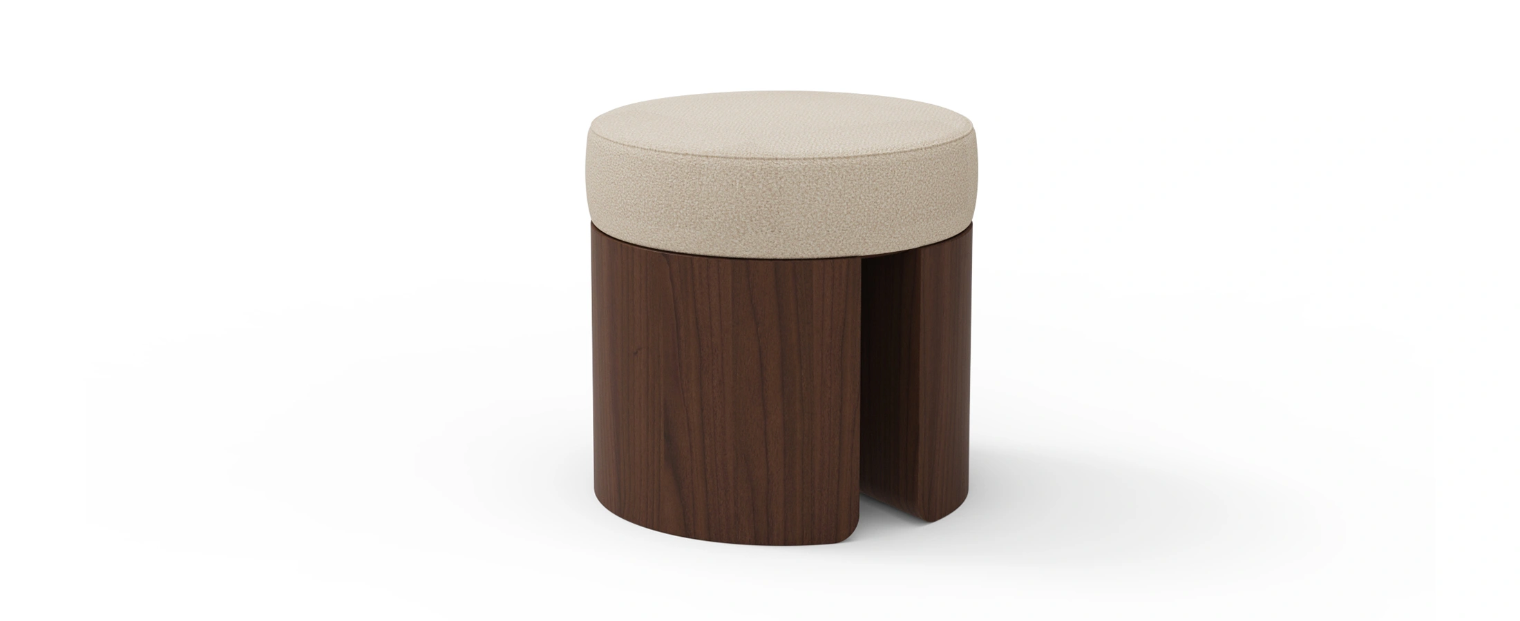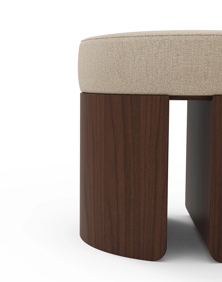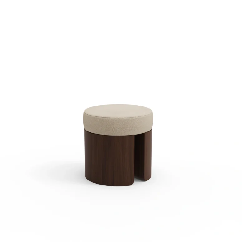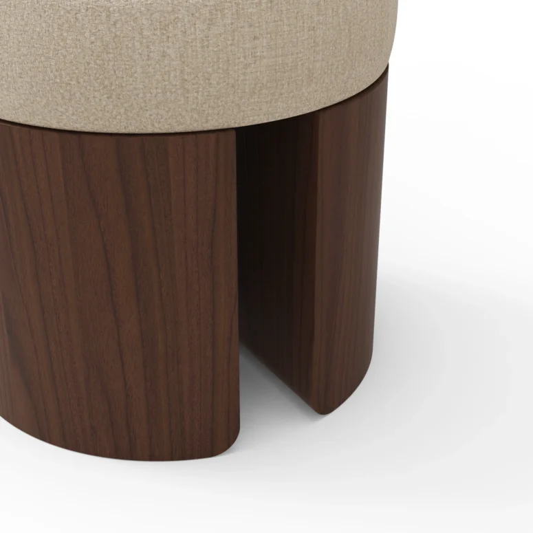 Pauline Stool, a perfect blend of modern design and classic materials. This versatile piece features a soft, upholstered seat in a neutral hue, providing both comfort and style. The sturdy walnut base adds a touch of sophistication, making it an ideal addition to any living space. Whether used as extra seating, a footrest, or a decorative accent, the Pauline Stool seamlessly fits into any interior decor.