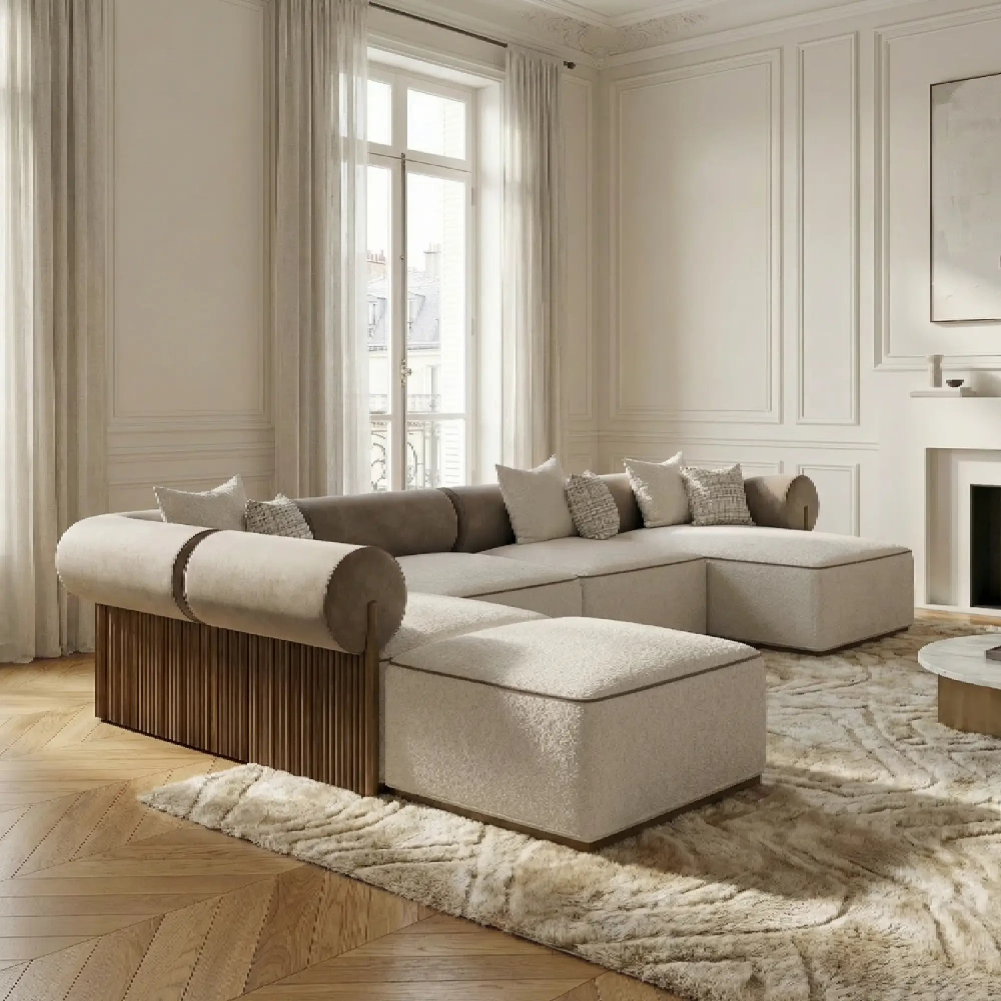 Proportions favour deep seating and long, relaxed postures, so the composition behaves as a true designer lounge sofa rather than a fixed block. From every angle, the sculptural profile and softened radii give the piece a quiet, drawn-from-plan clarity.
