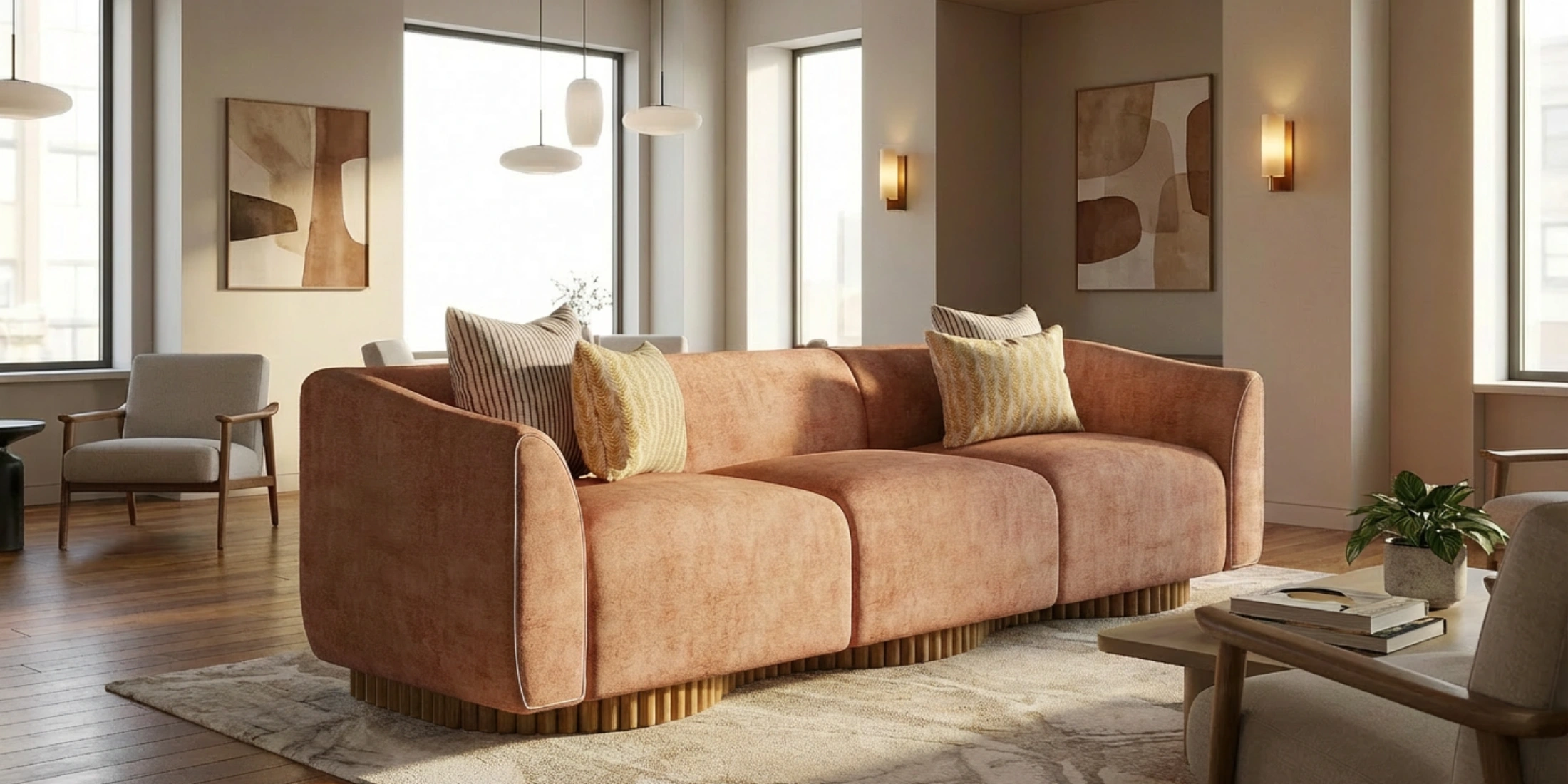 Wave Sofa is a luxury curved velvet sofa conceived as a low, flowing volume for composed living spaces. Its continuous line reads as a single gesture, bringing softness to architectural rooms without visual noise.