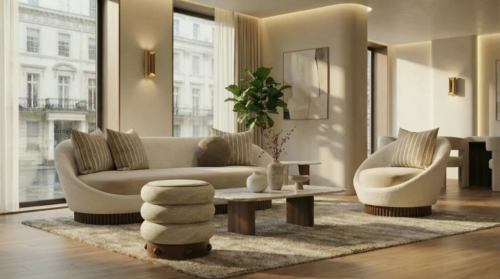 Velvet’s ability to hold saturated color makes it a powerful tool for nuanced palettes. Deep emeralds, muted sapphires, warm cognacs, and sophisticated neutrals all gain richness when rendered in velvet. As a result, designer armchairs upholstered in velvet often become the chromatic focal point of a living room.